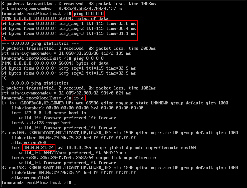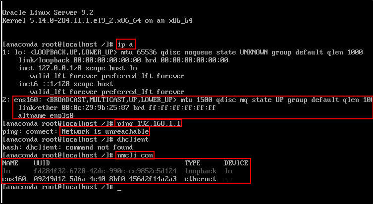 Check your network interface (e.g., ens160). If it has no IP, it is not connected.