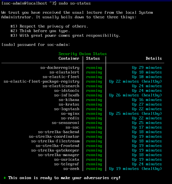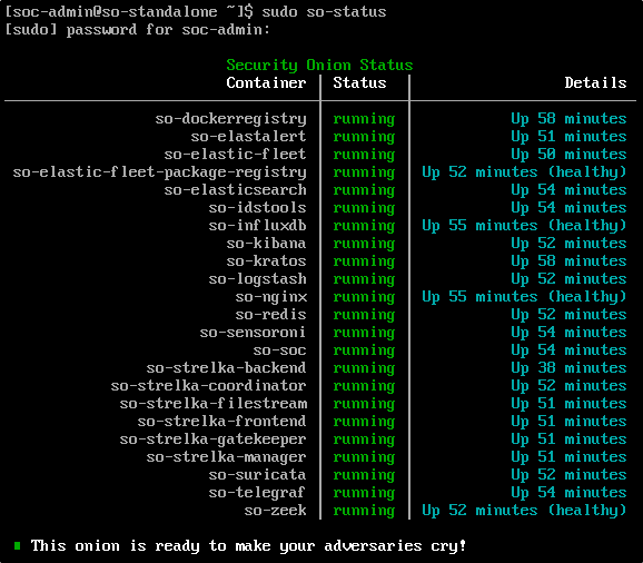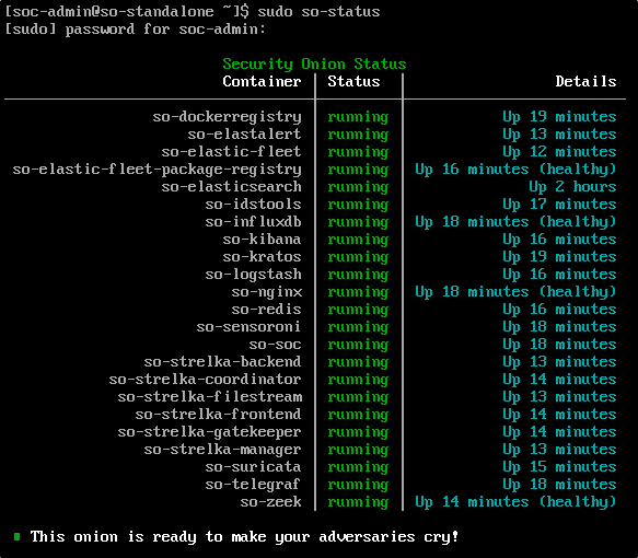 Verify that all containers are running by entering the following command on the terminal of the Security Onion VM: