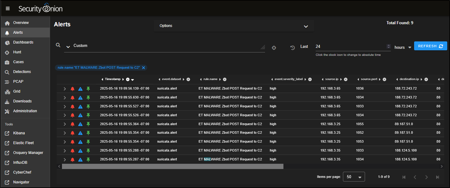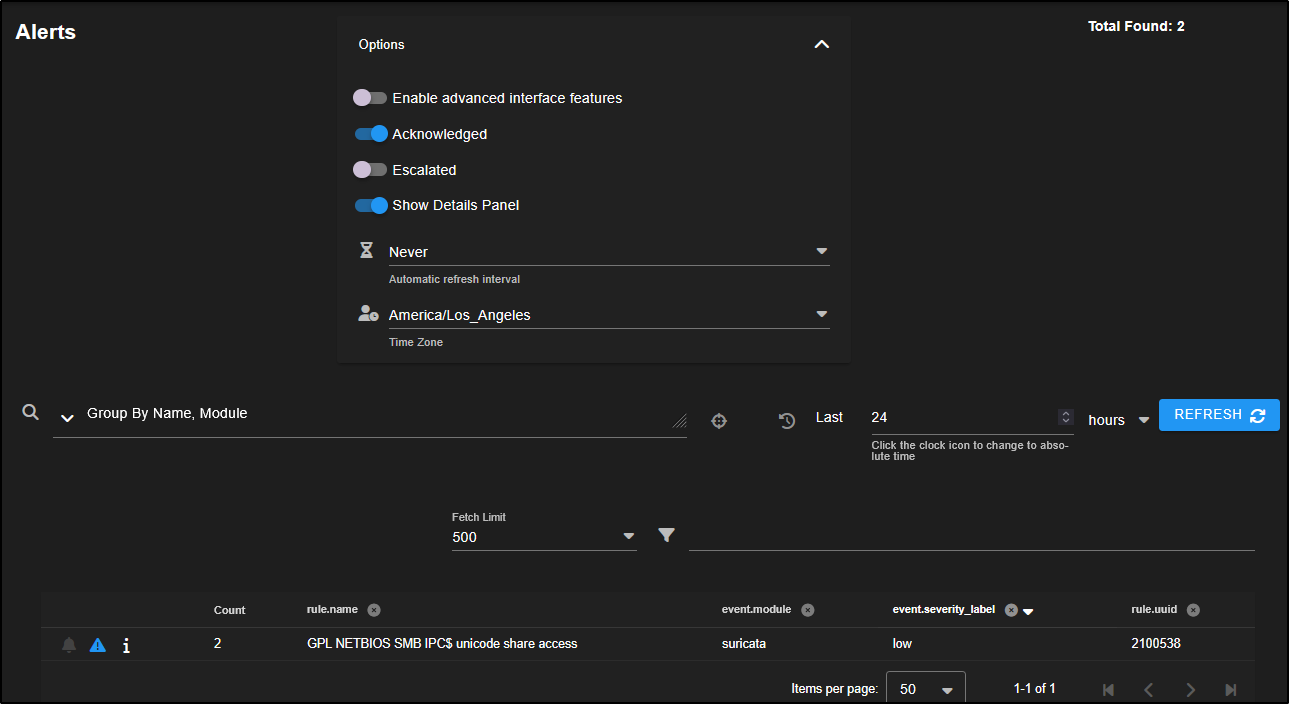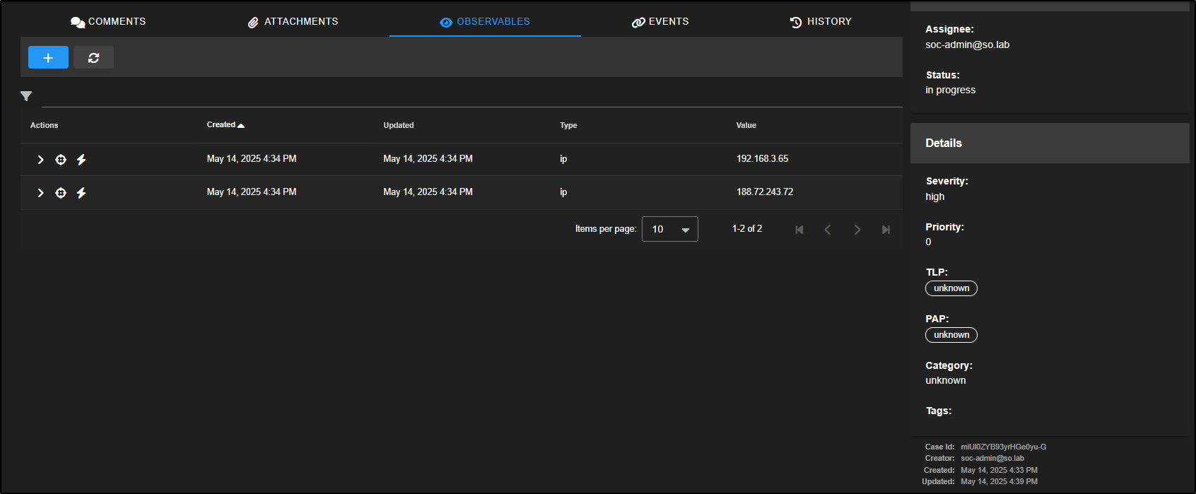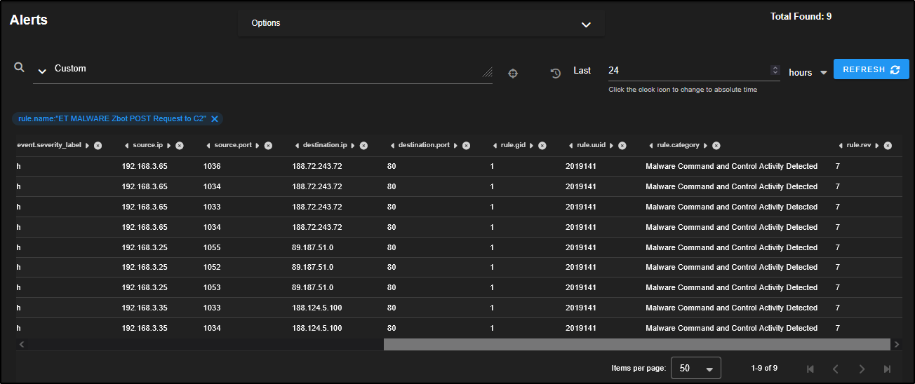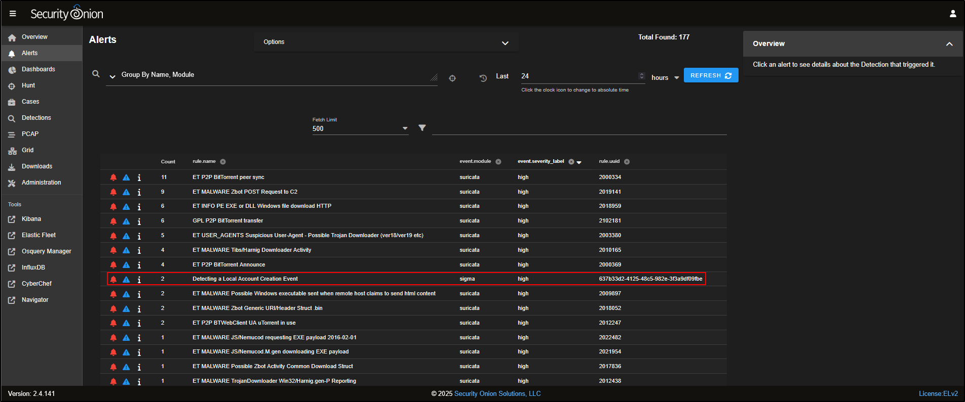 Head to the Alerts page in the SOC web interface. You should see an alert confirming that the rule successfully triggered based on this activity.