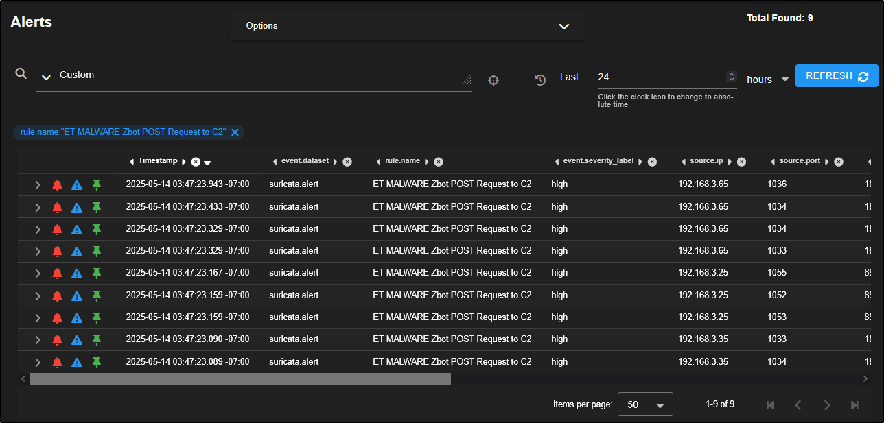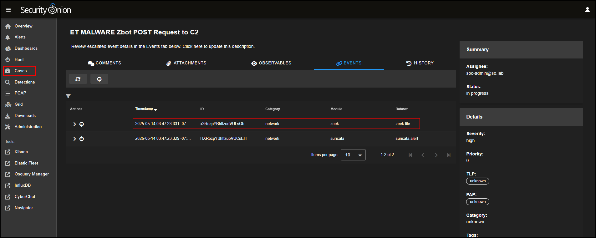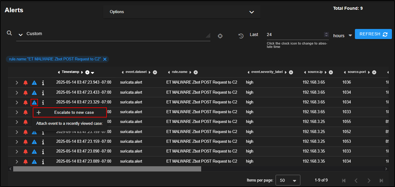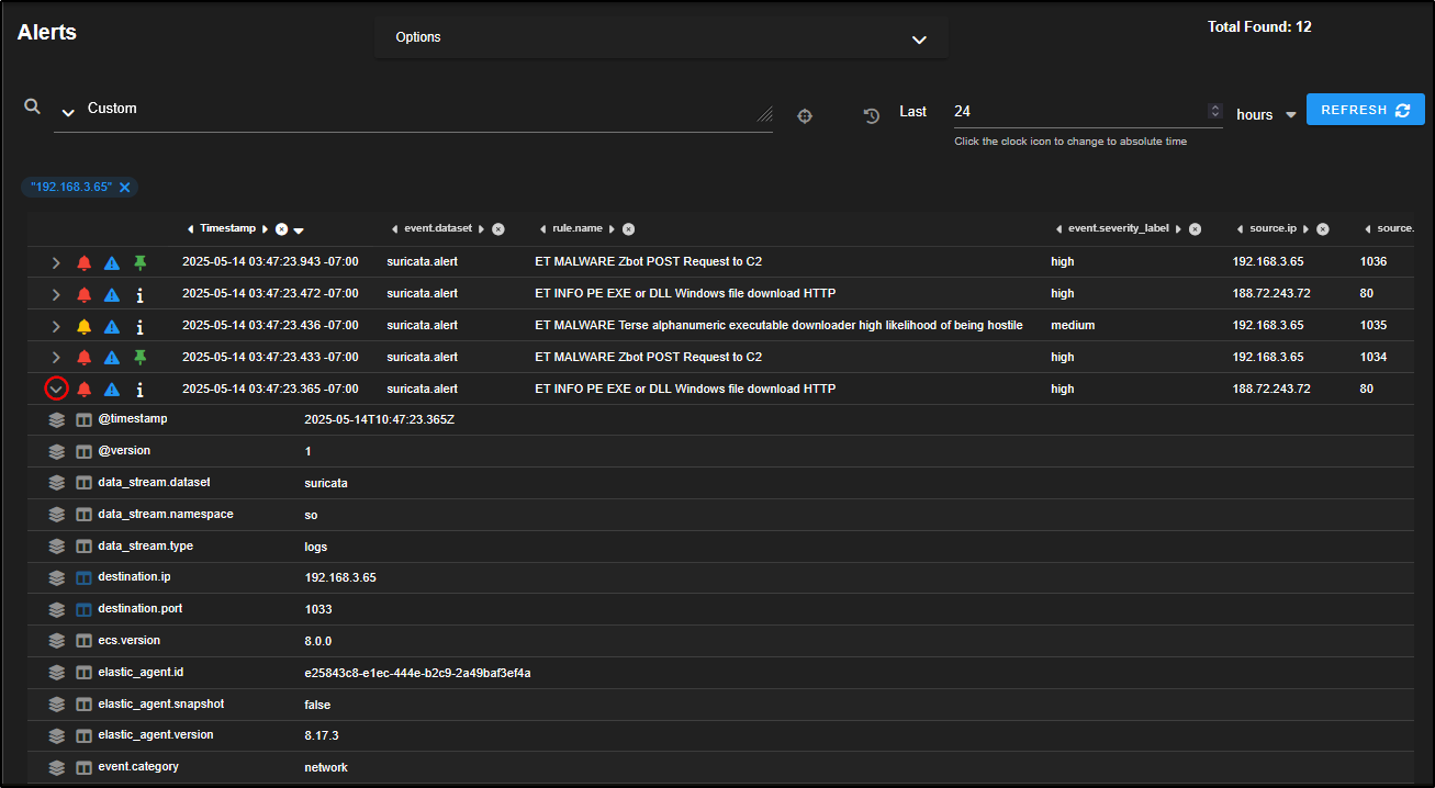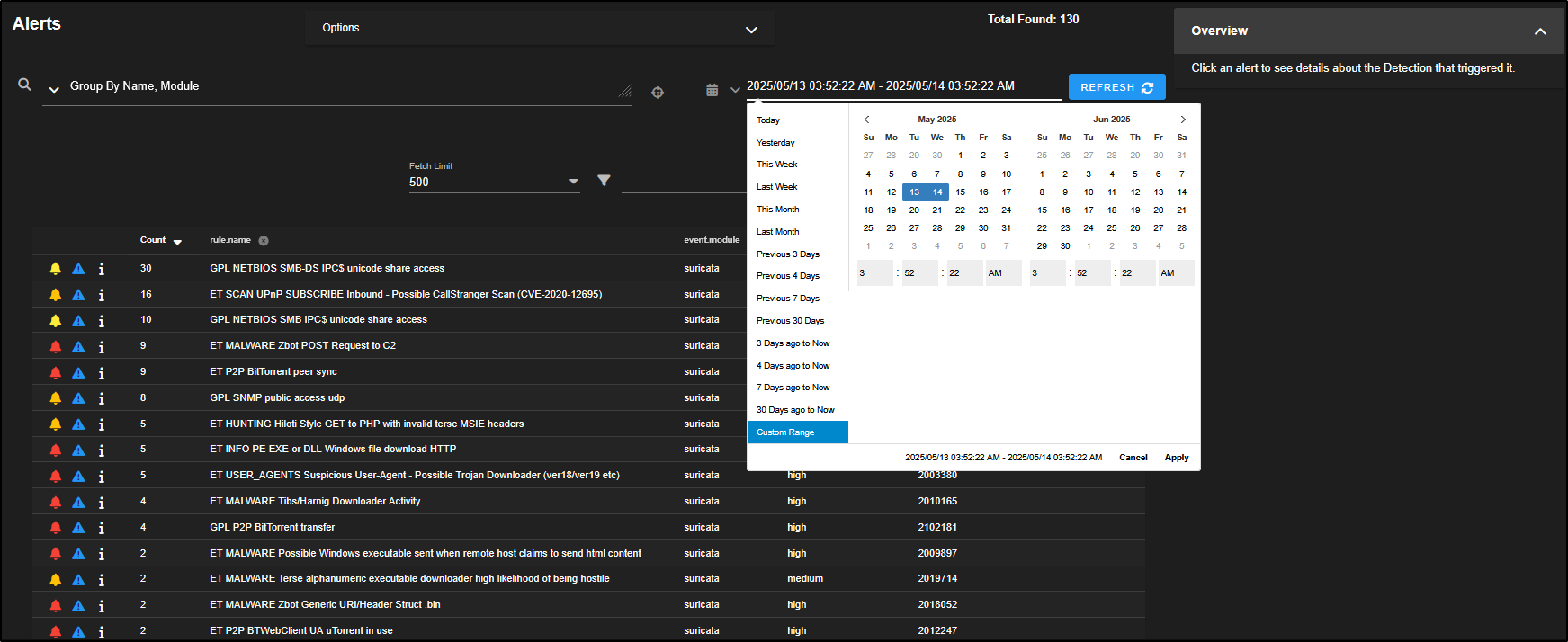 Head to the Alerts page in the SOC web interface. You should see an alert confirming that the rule successfully triggered based on this activity.