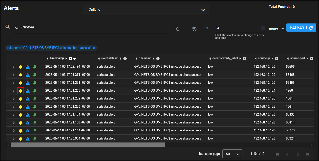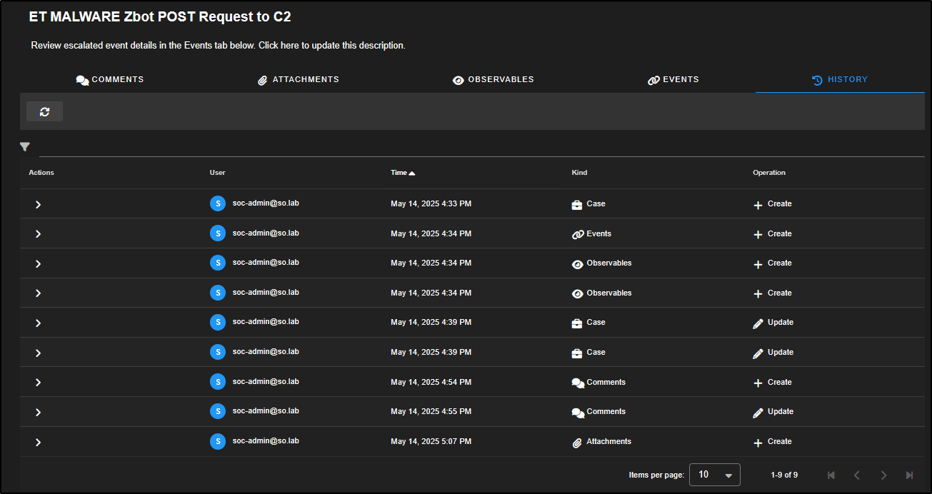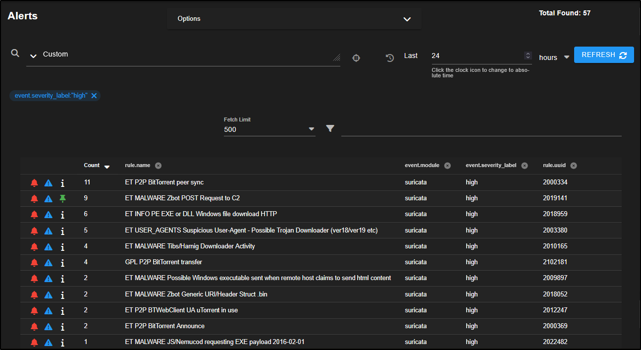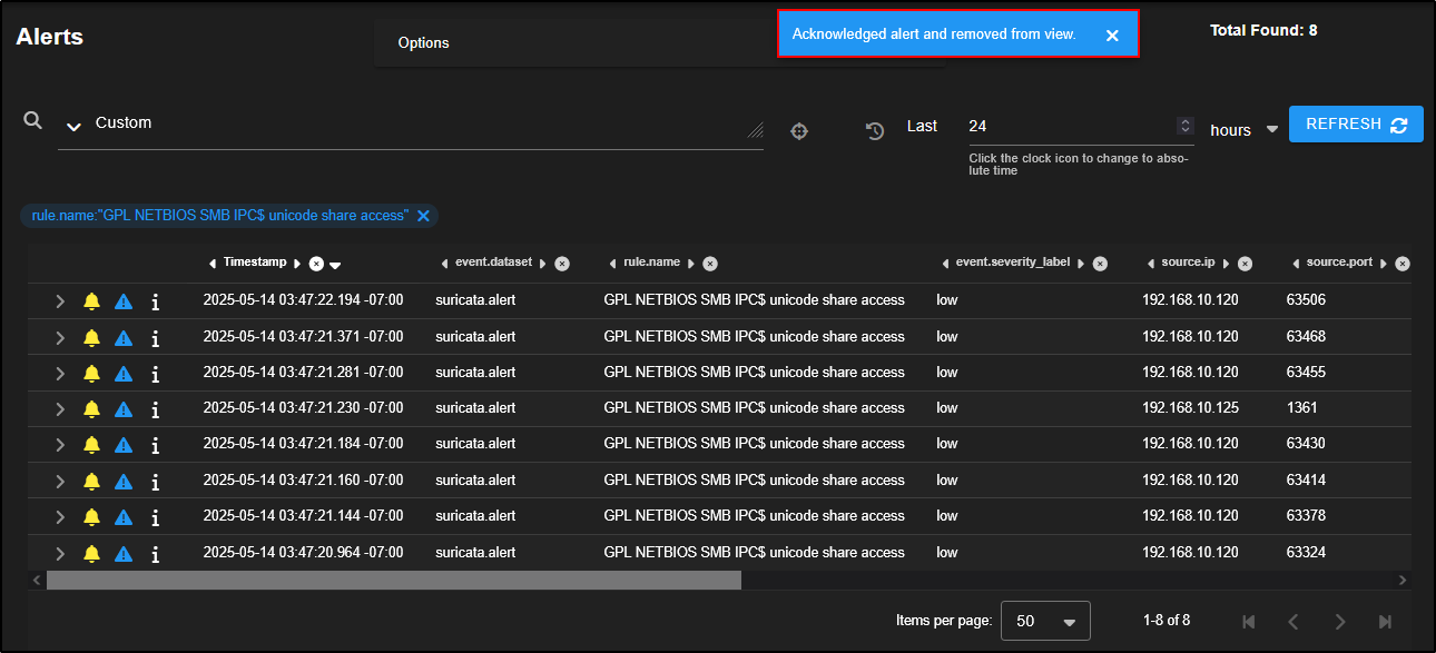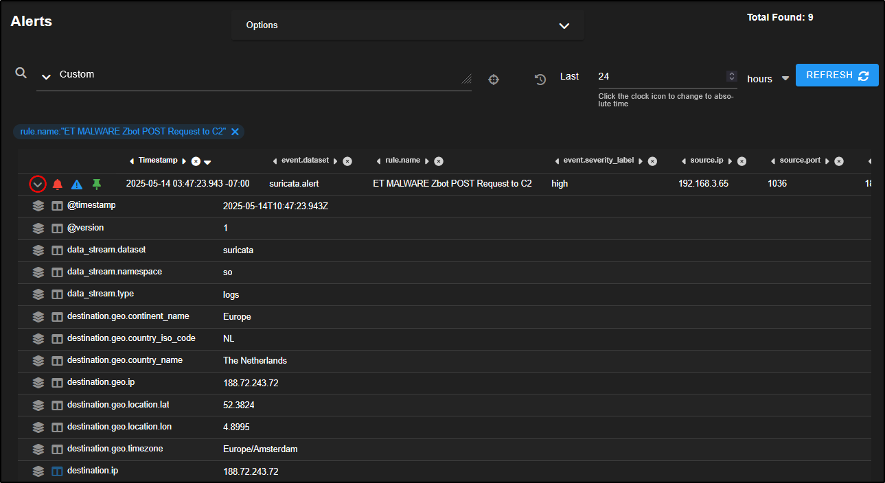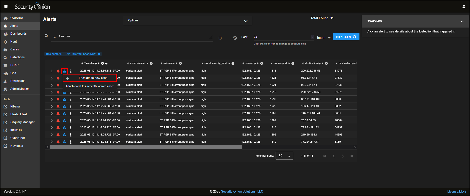 Head to the Alerts page in the SOC web interface. You should see an alert confirming that the rule successfully triggered based on this activity.