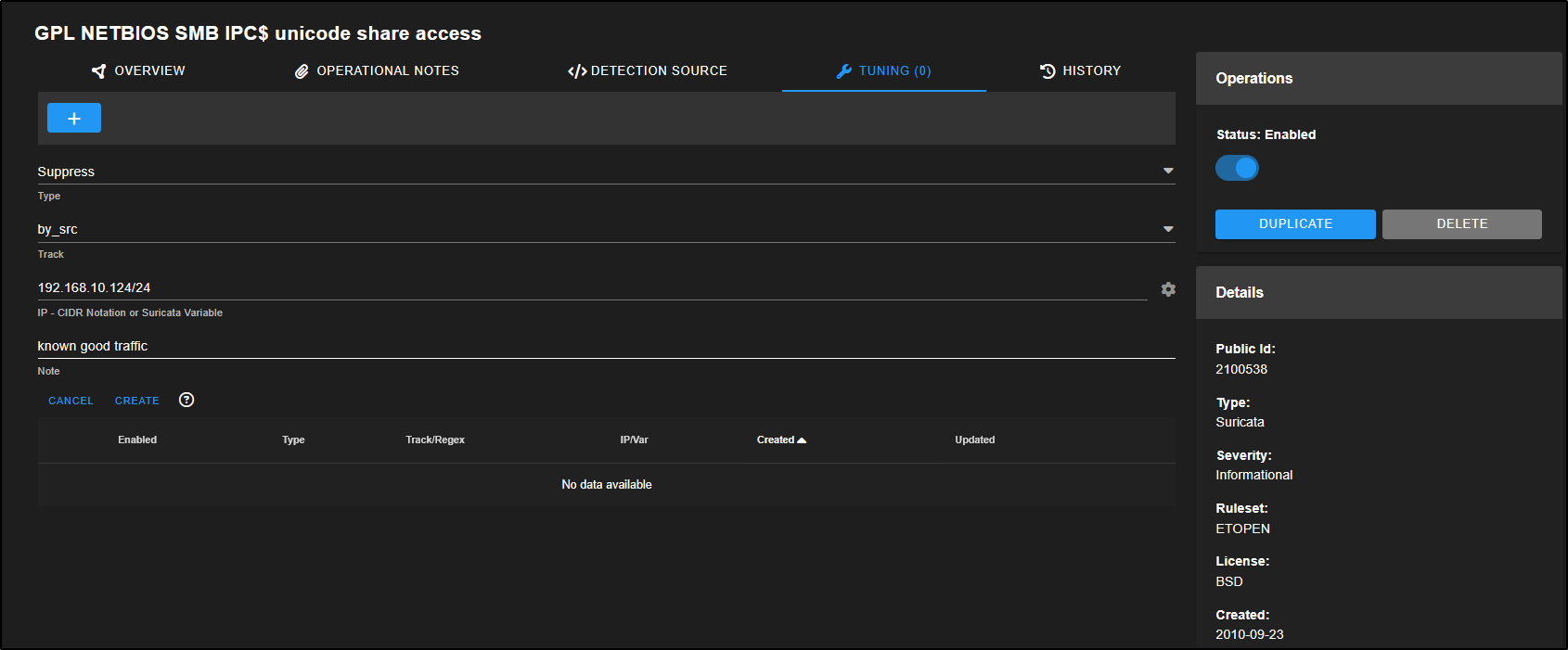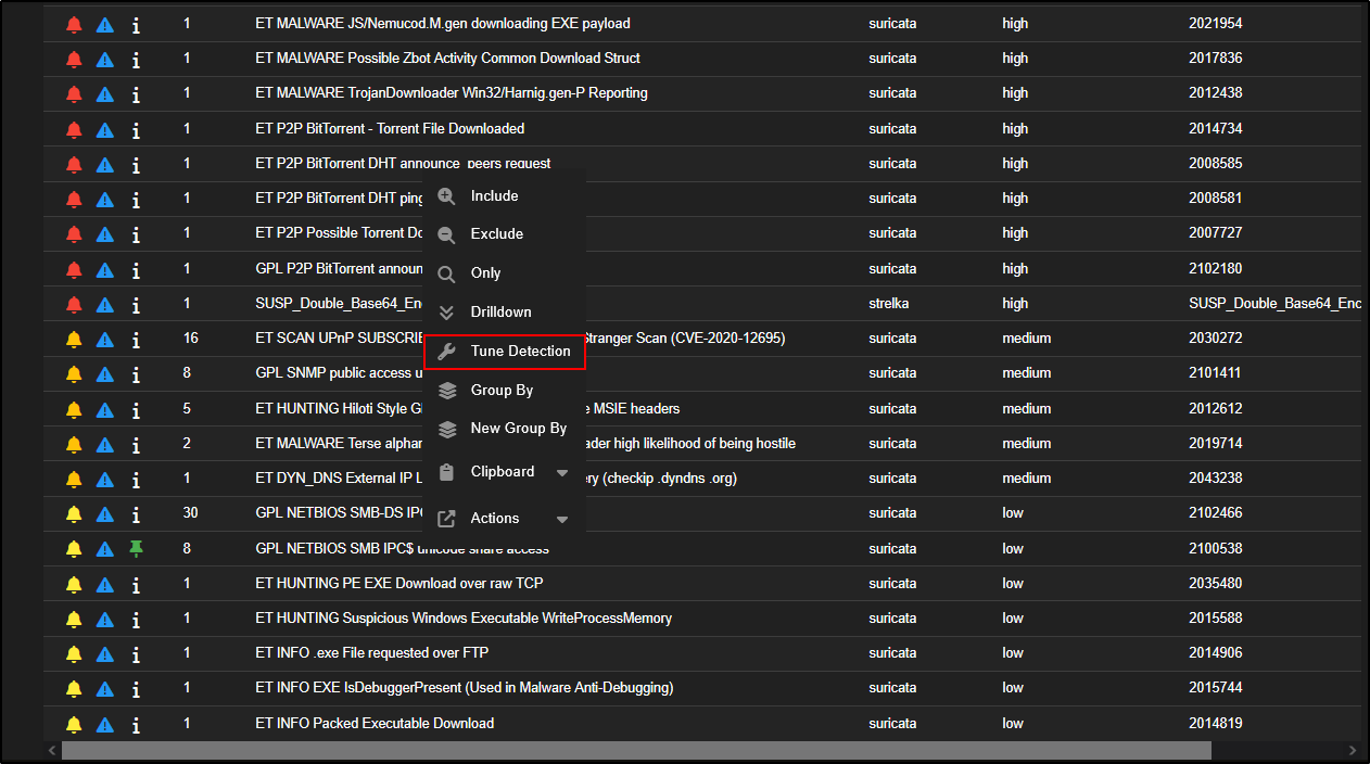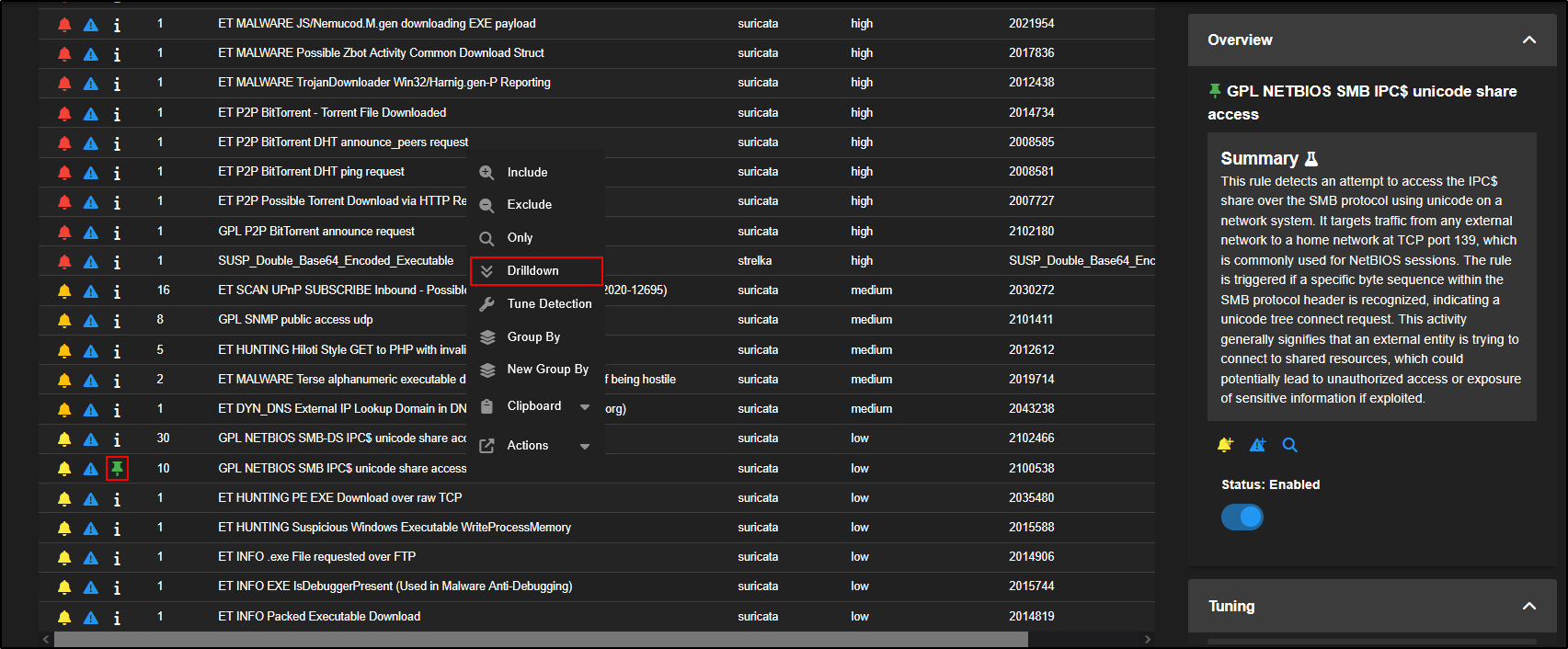 The Tuning tab gives you a tailored interface for adjusting each rule type to better suit your environment. For instance, Suricata rules can be suppressed or have thresholds set, while Sigma rules can be fine-tuned using Sigma filters.