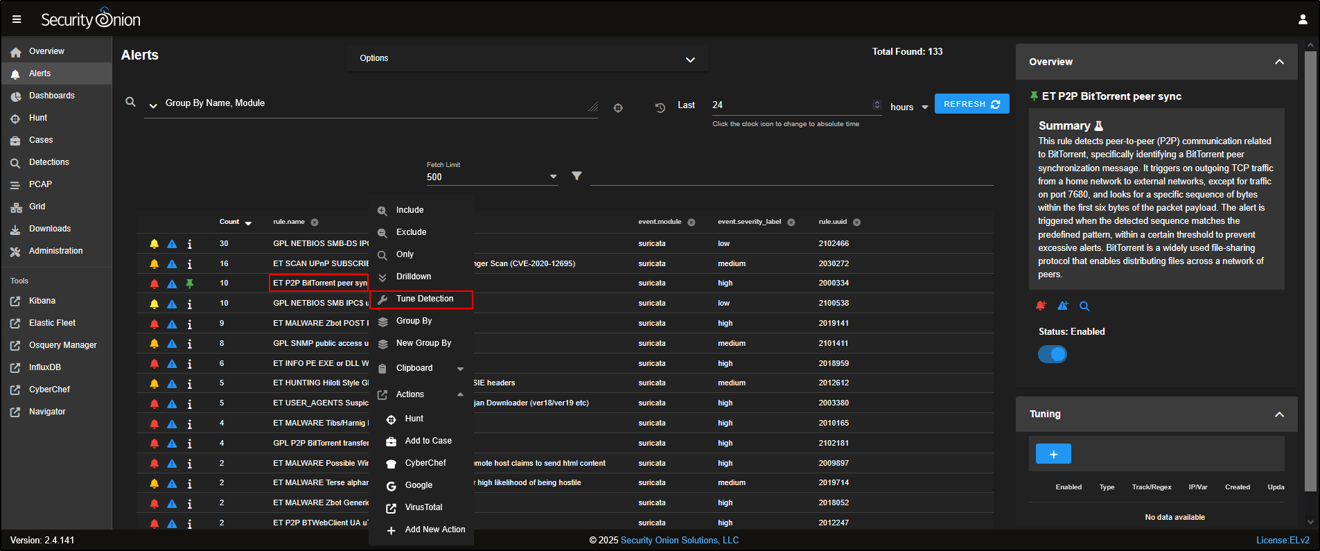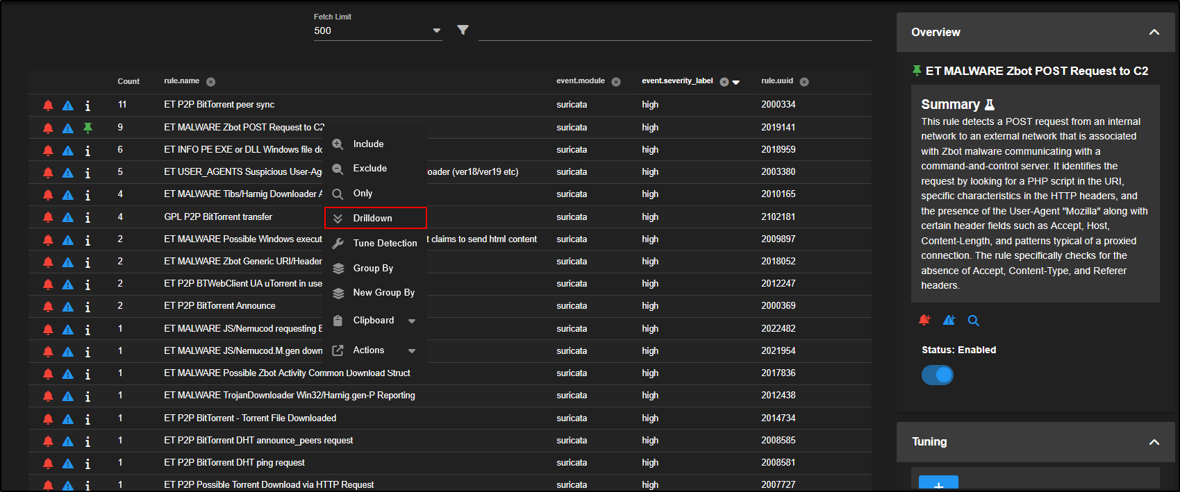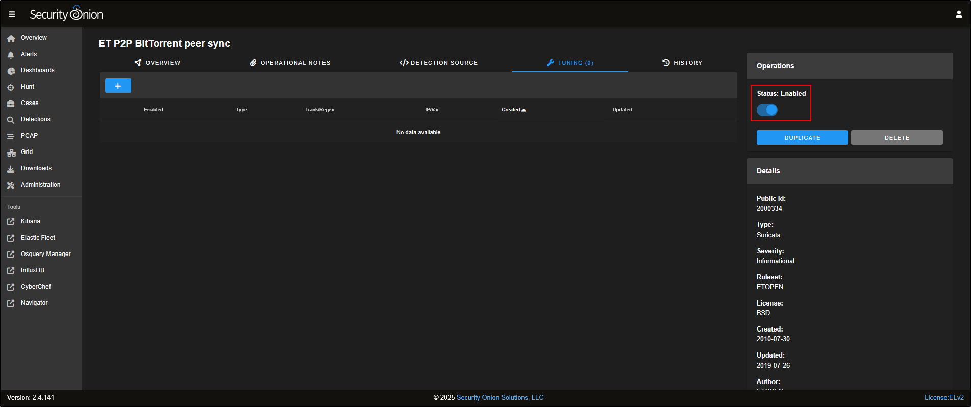 The Tuning tab gives you a tailored interface for adjusting each rule type to better suit your environment. For instance, Suricata rules can be suppressed or have thresholds set, while Sigma rules can be fine-tuned using Sigma filters.