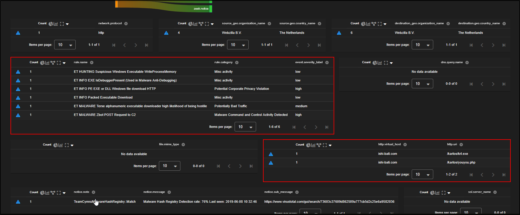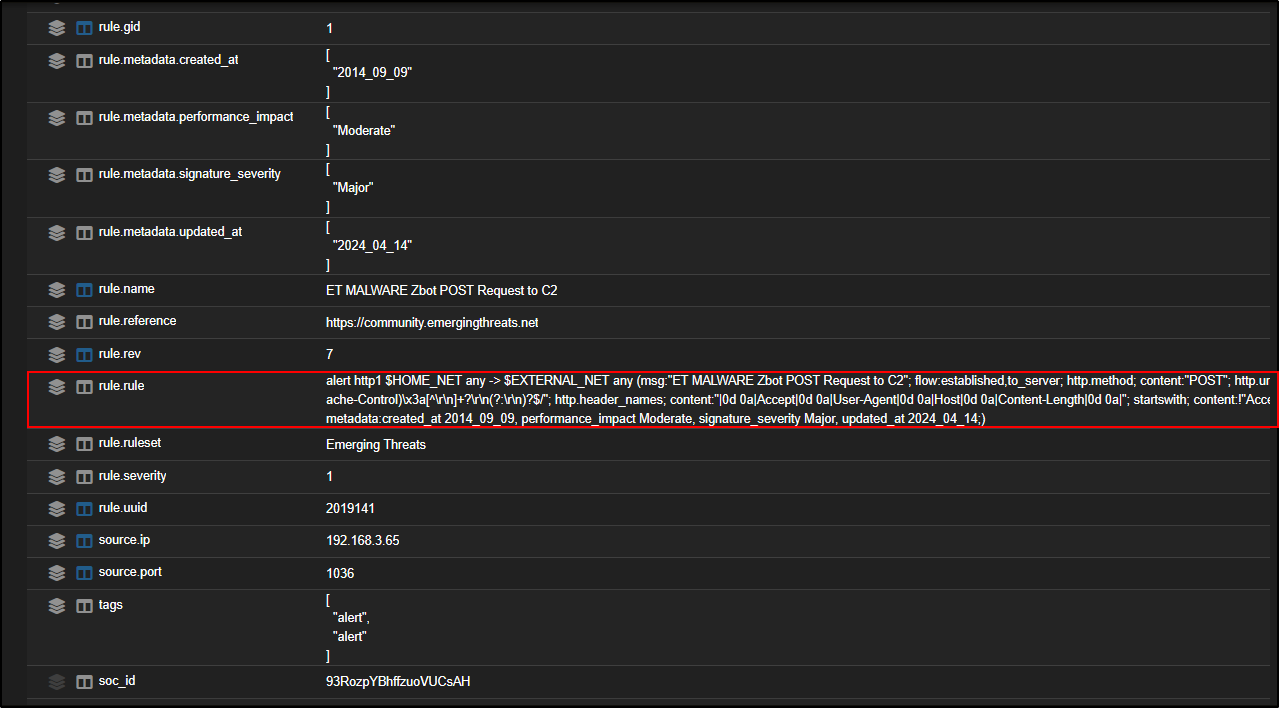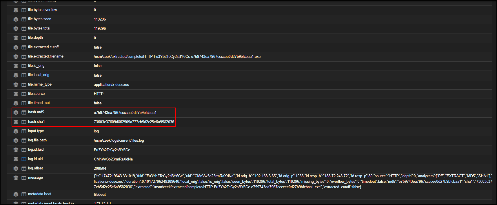 and checks them using Yara rules via the strelka module. These rules are useful for spotting files with suspicious patterns, like those containing malware-related strings or known risky behaviours (e.g. Office macros). If you need to detect an executable signed with a specific certificate, Yara is the way to go. - Sigma rules are used for log-based detection. They work by creating Elastic Query Language (EQL) queries that regularly scan collected logs (like Windows event logs or Sysmon) for known Indicators of Compromise (IOCs). When a match is found, an alert is generated.