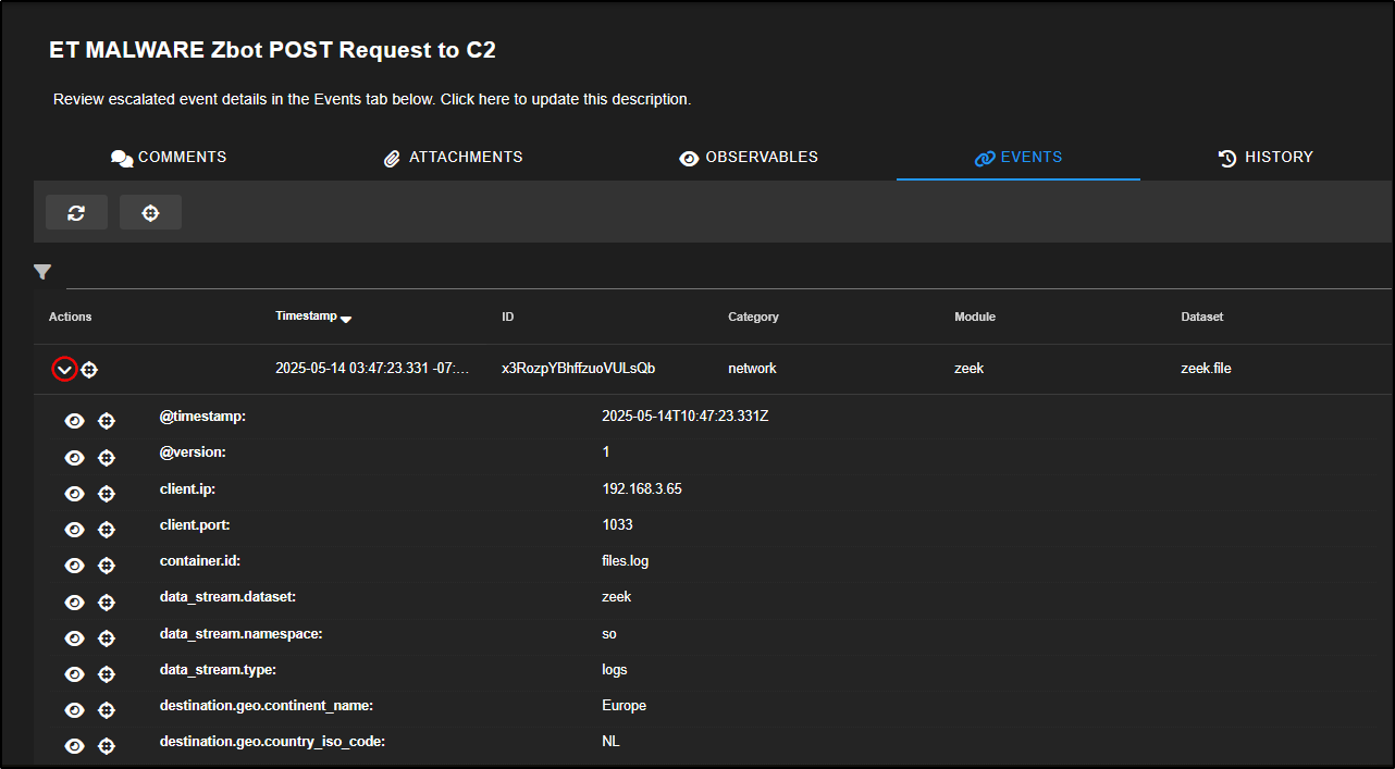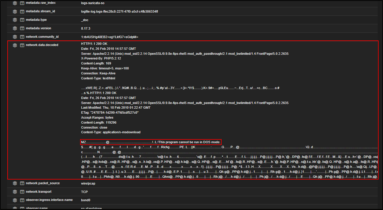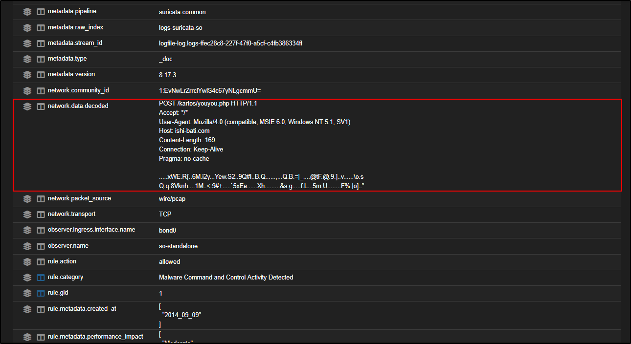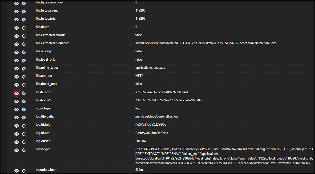 and checks them using Yara rules via the strelka module. These rules are useful for spotting files with suspicious patterns, like those containing malware-related strings or known risky behaviours (e.g. Office macros). If you need to detect an executable signed with a specific certificate, Yara is the way to go. - Sigma rules are used for log-based detection. They work by creating Elastic Query Language (EQL) queries that regularly scan collected logs (like Windows event logs or Sysmon) for known Indicators of Compromise (IOCs). When a match is found, an alert is generated.