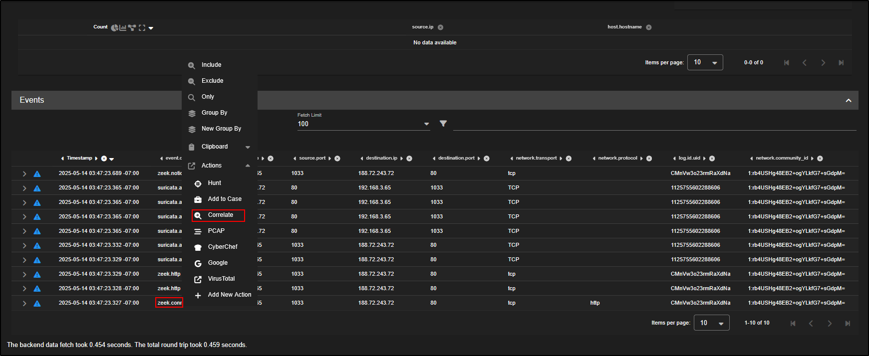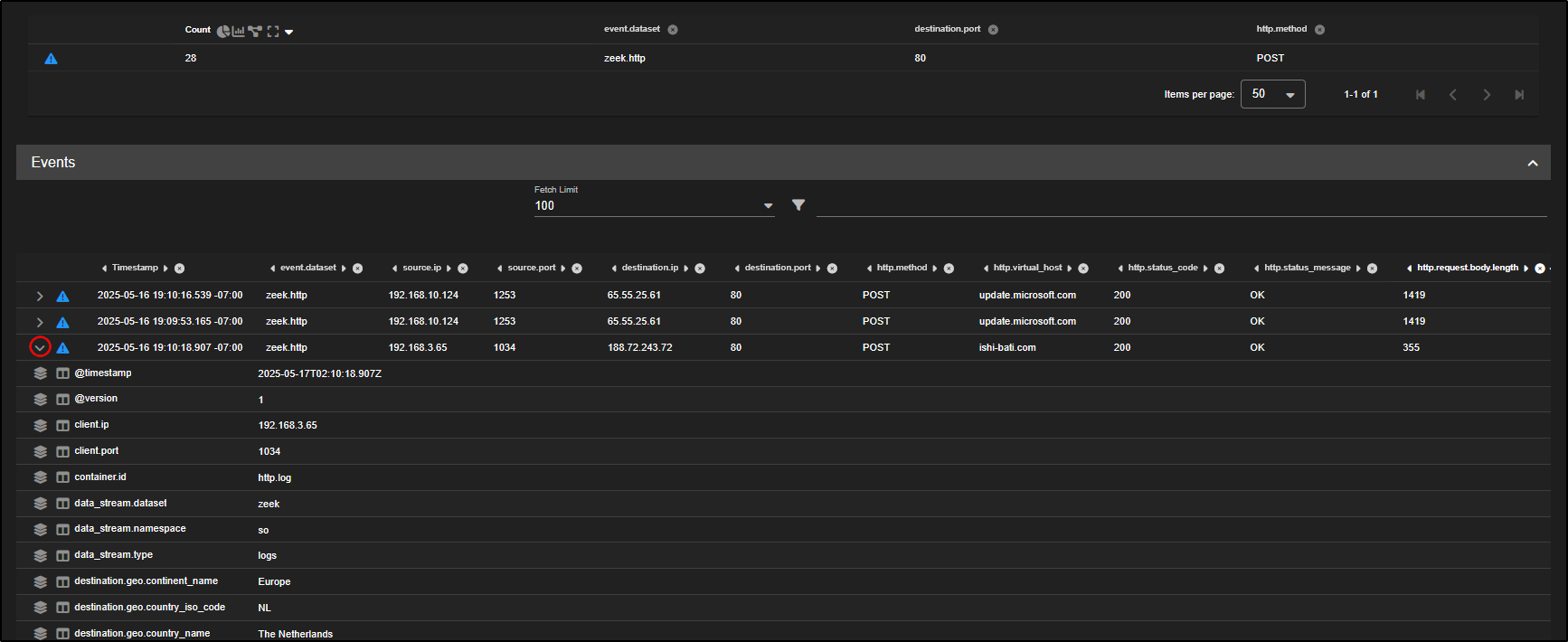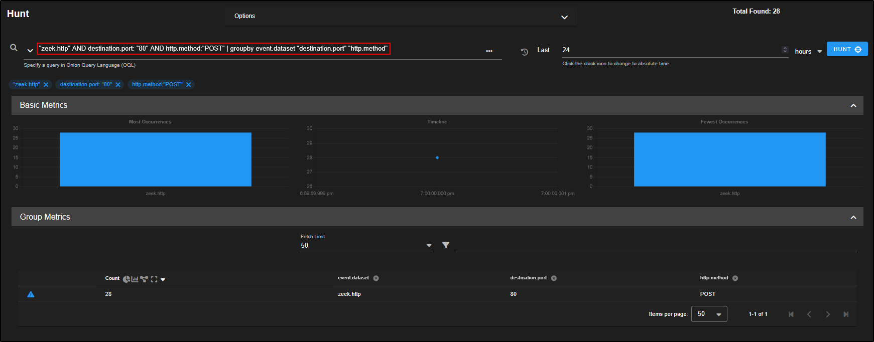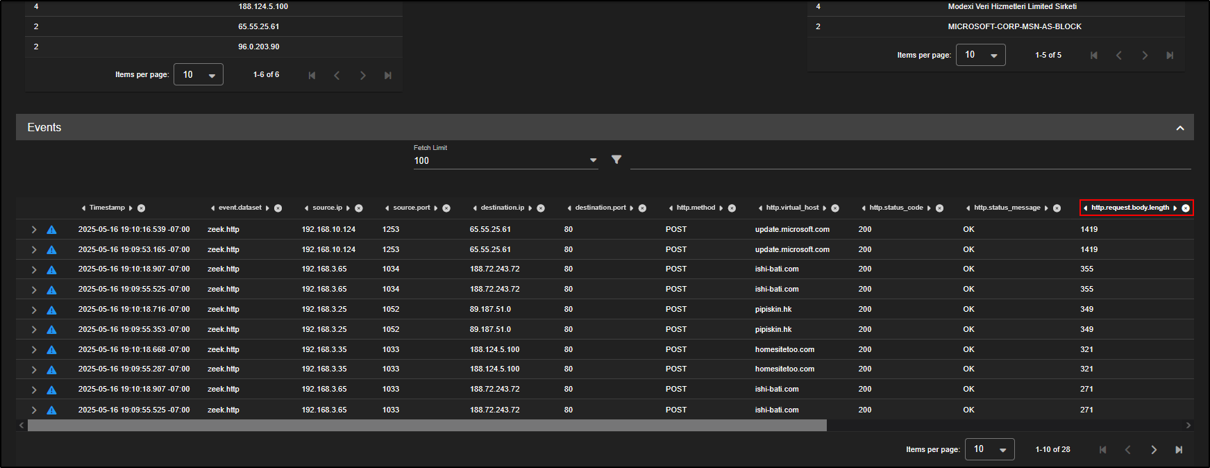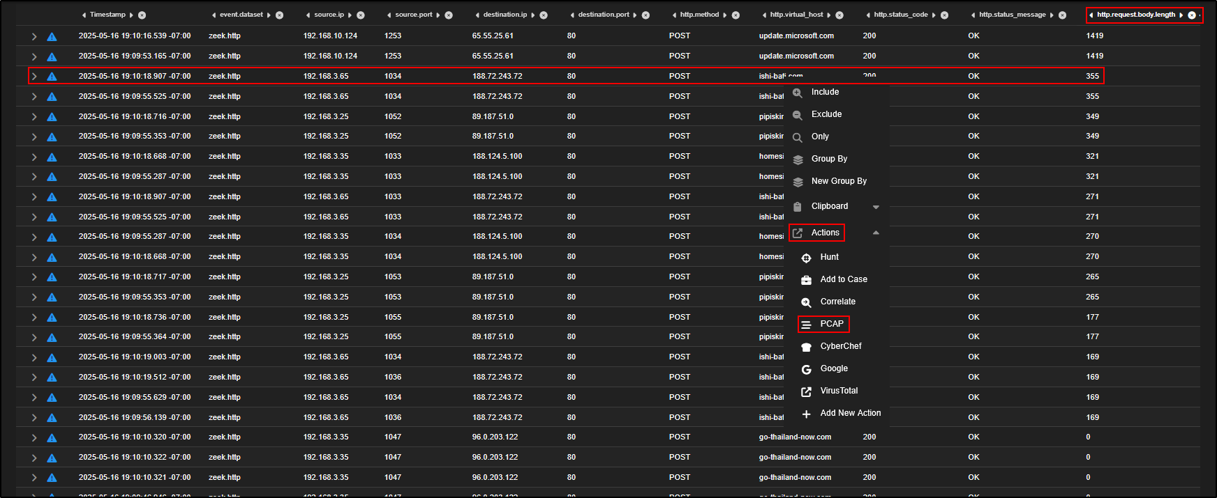 to prioritise entries with larger POST payloads. You should now see the same suspicious activity identified earlier in the Hunt interface, confirming consistency across both views.