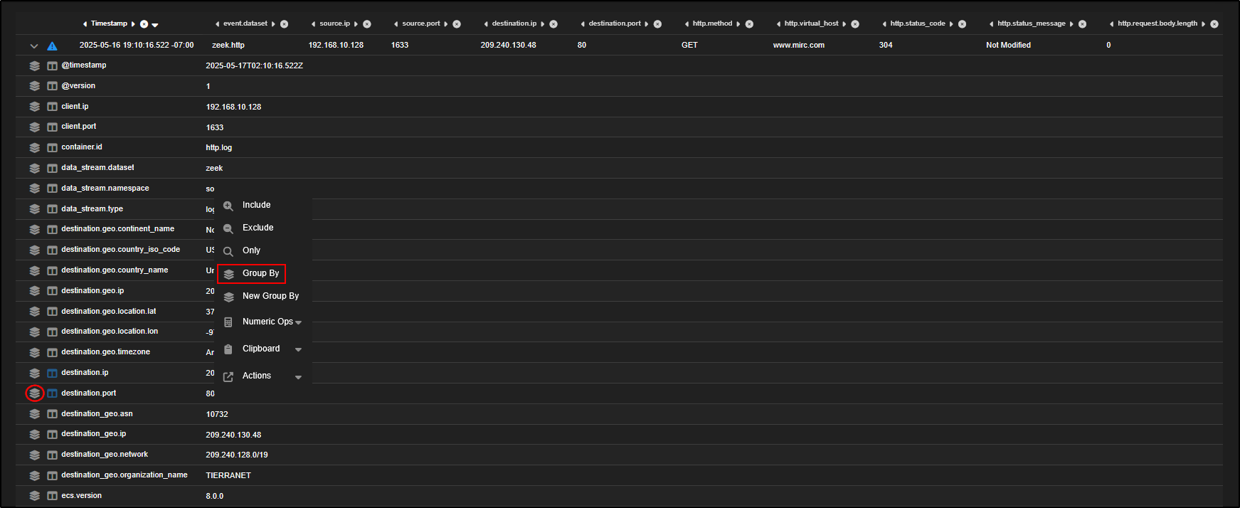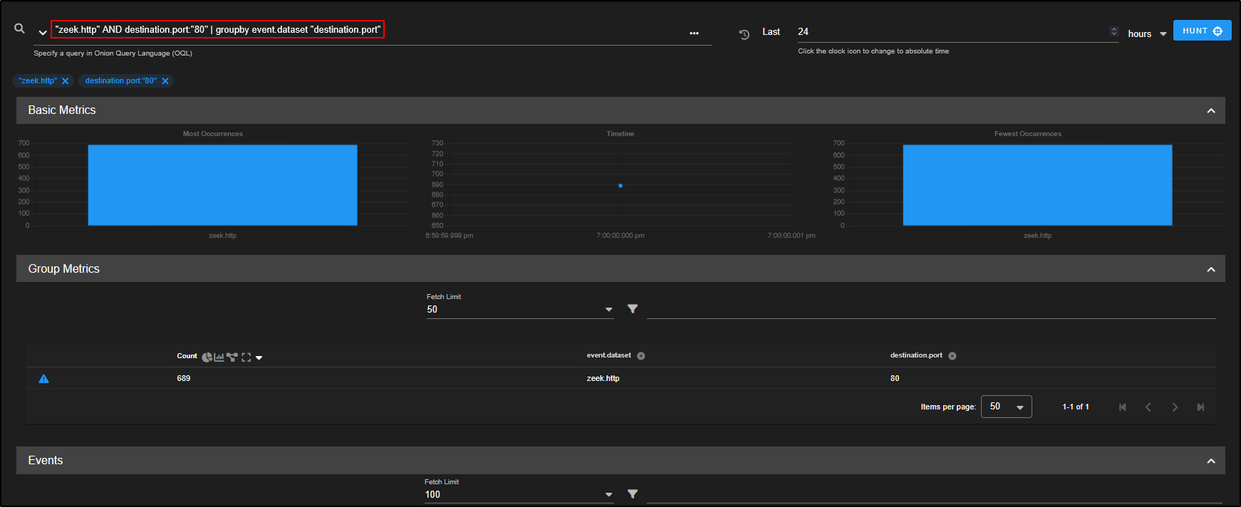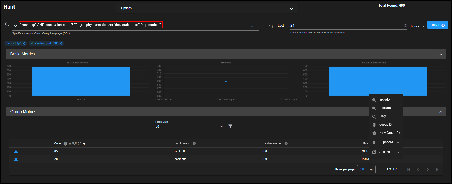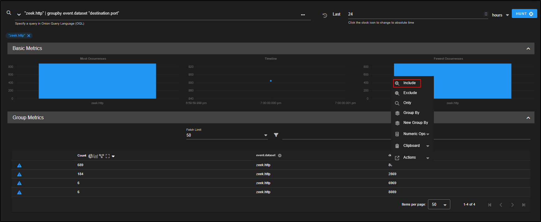 To filter for port 80 traffic, you can do it just like in the Hunt interface, by selecting destination.port 80 and choosing Include to narrow the results.