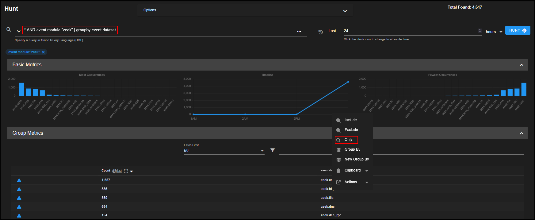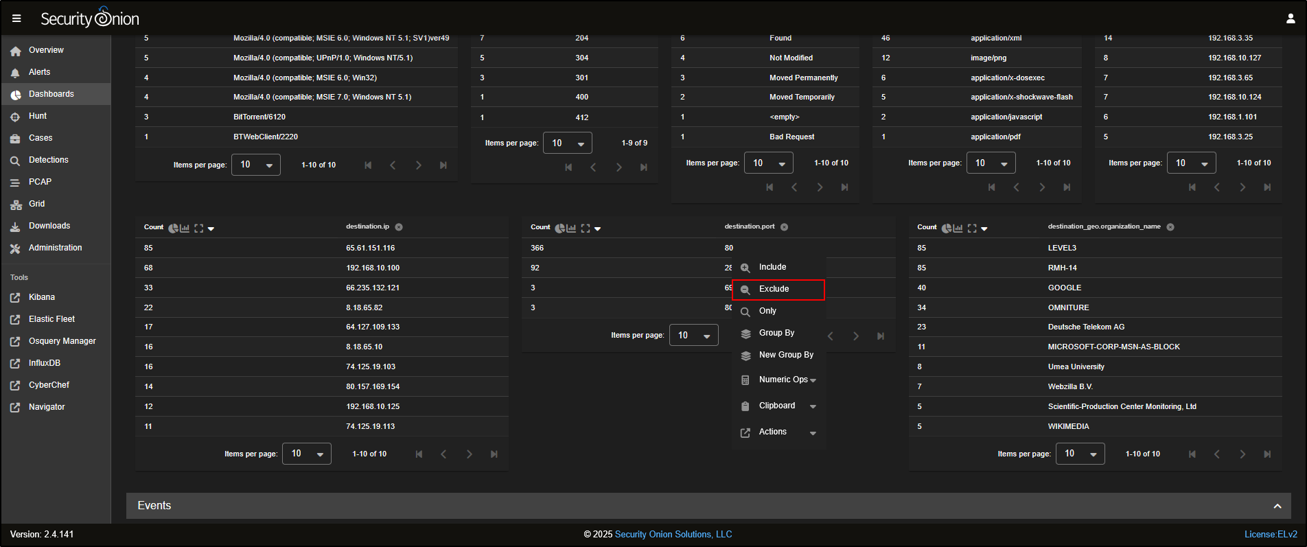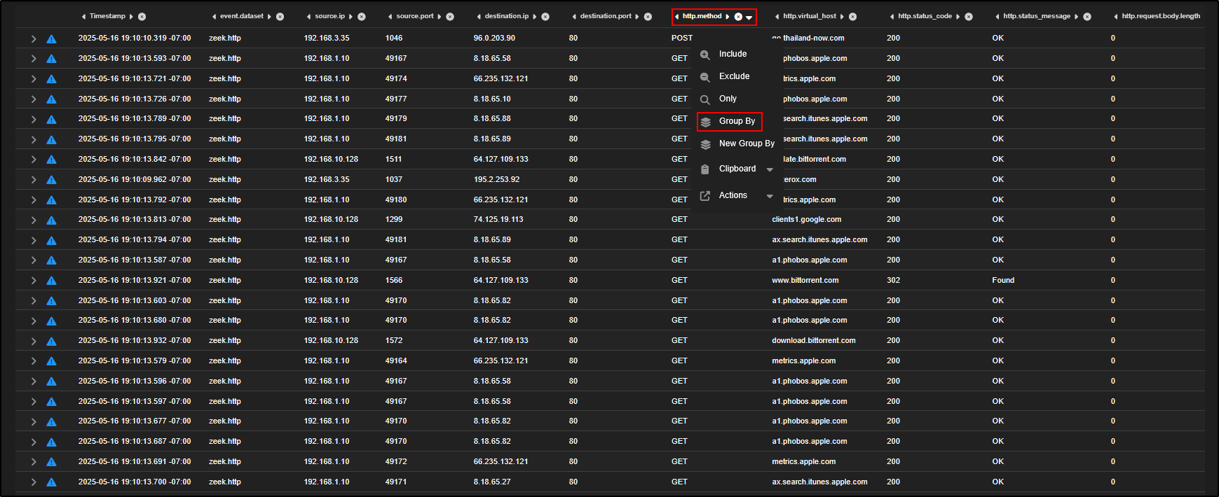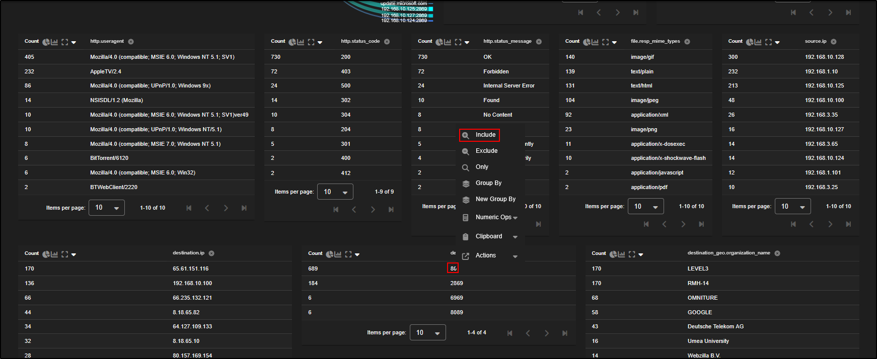 To filter for port 80 traffic, you can do it just like in the Hunt interface, by selecting destination.port 80 and choosing Include to narrow the results.