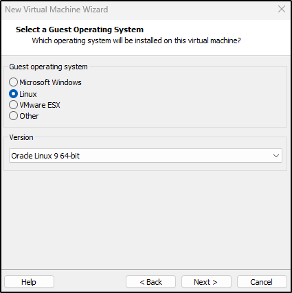 For Guest operating system, select Linux and Oracle Linux 9 (64-bit).