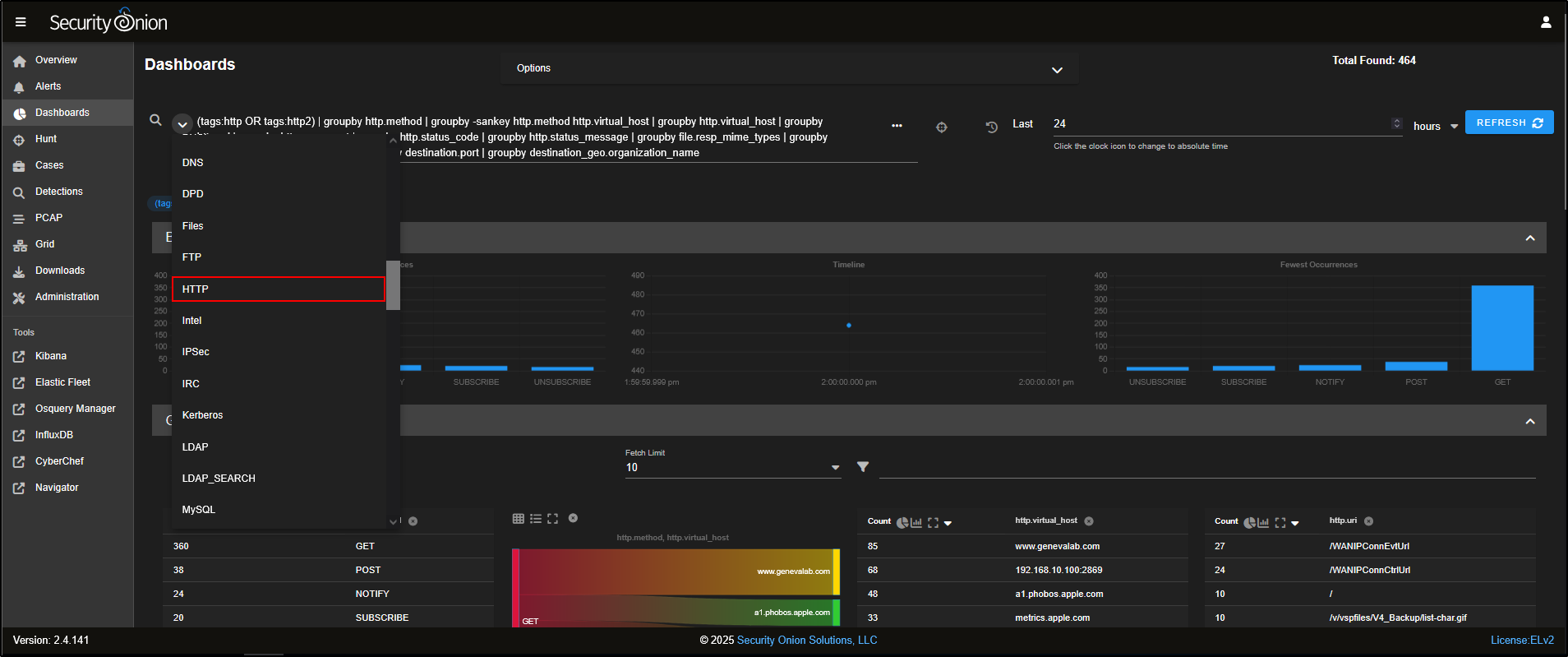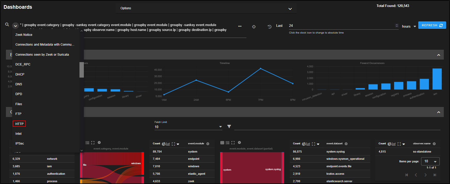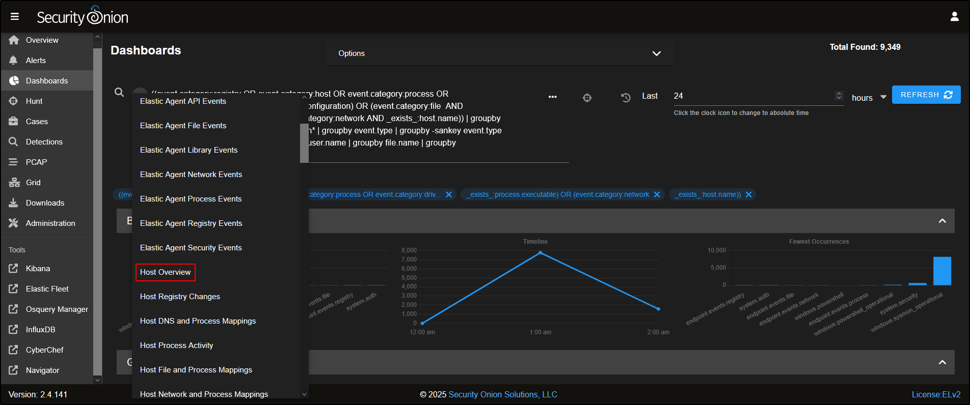 To verify that host logs are being ingested, navigate to the Dashboards page and select Host Overview on SOC web interface.