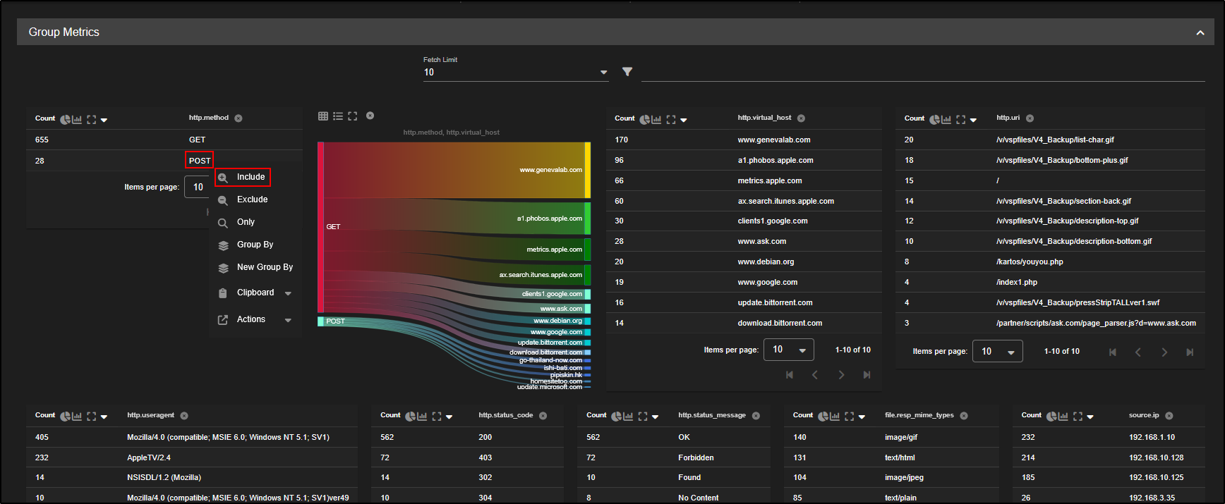 , click on POST, and choose Include. This will filter the dashboard to show only HTTP POST traffic.