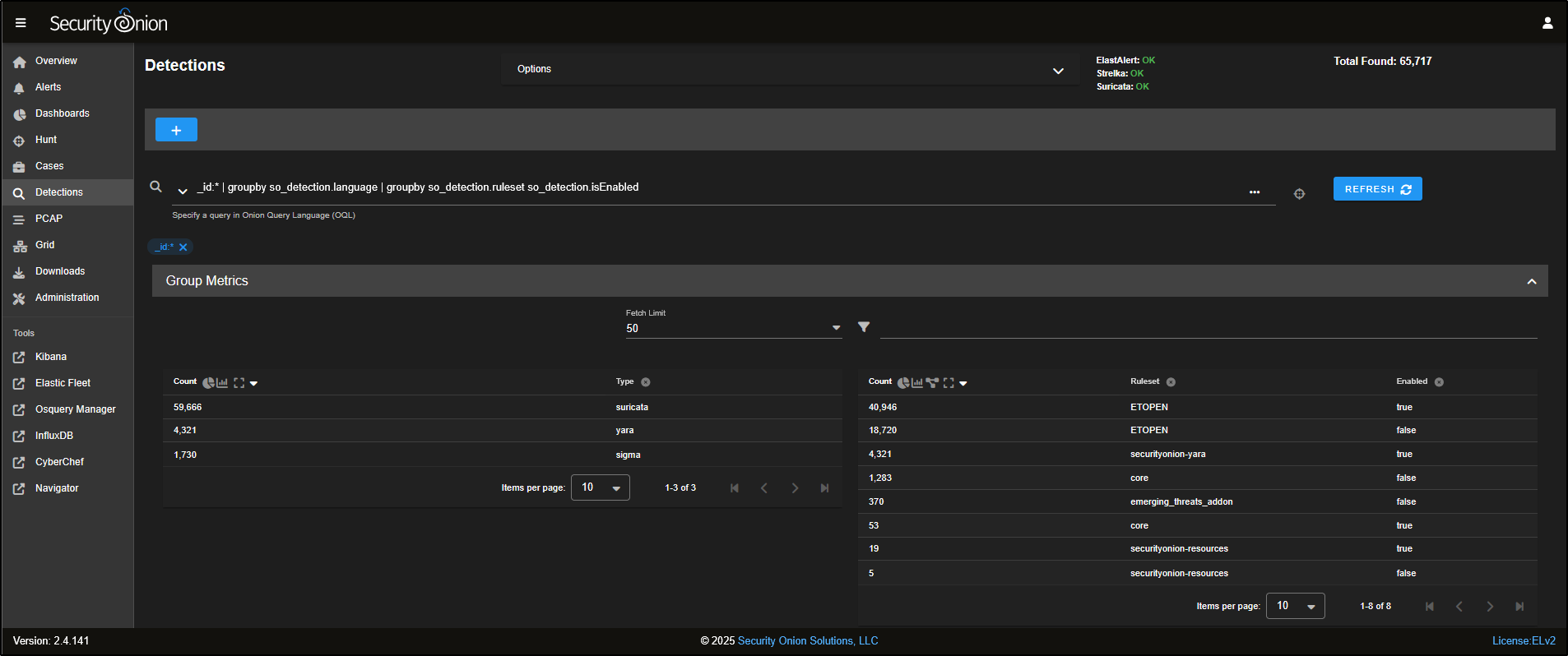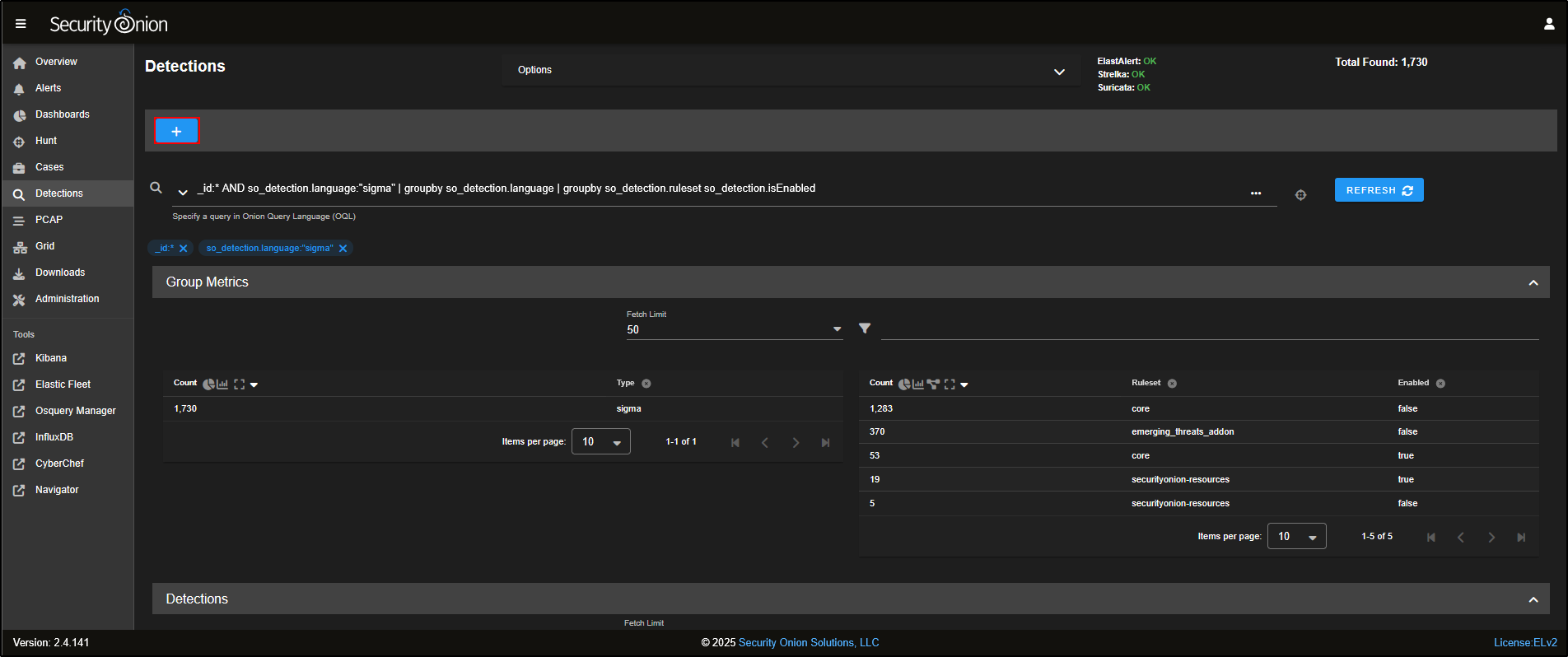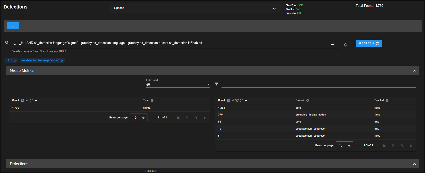 Go to the Detections section in the SOC web interface. By default, it displays all available rules, grouped by detection language.