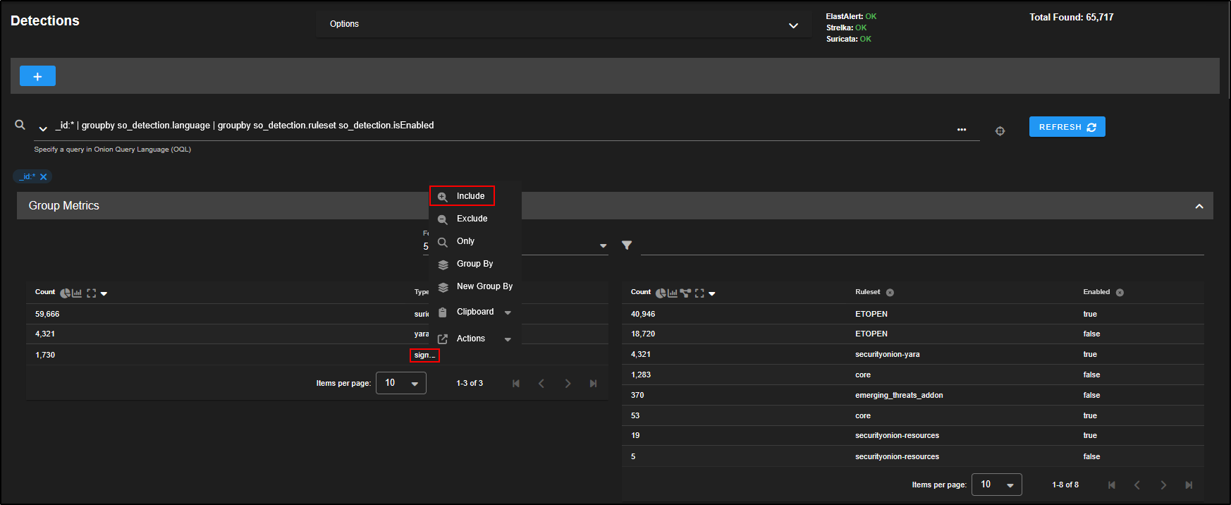 For instance, if you only want to view Sigma rules, simply click on sigma and choose Include. You will notice that the detection results and the list of enabled rules update to reflect that filter.