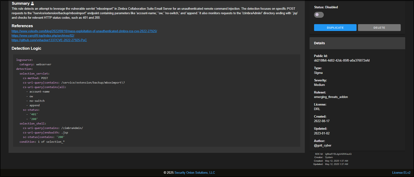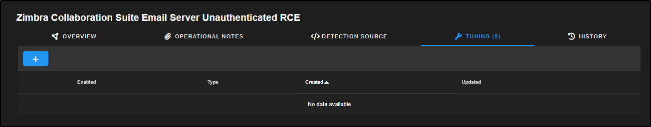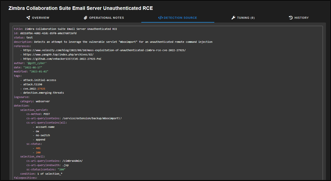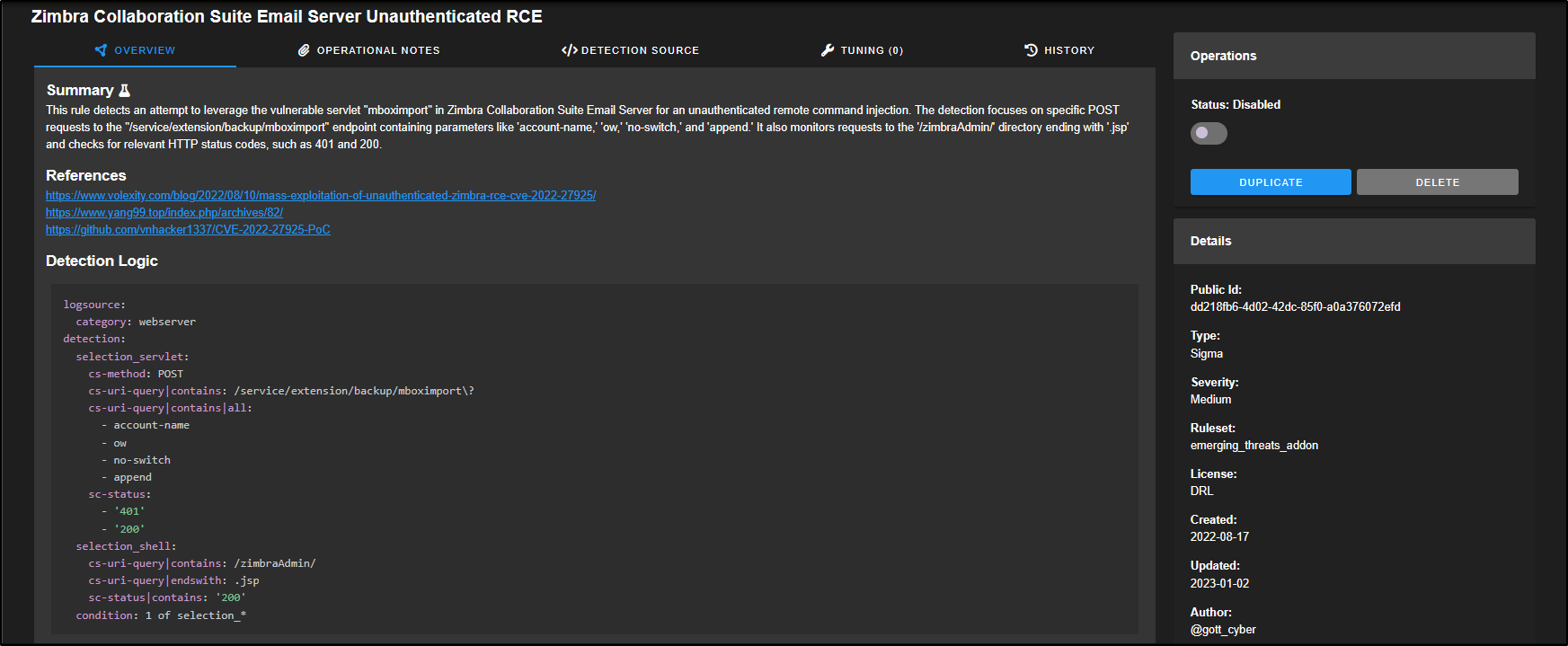 This opens the tuning interface for that specific rule. The Overview tab shows a summary of the rule, any related references, and the detection logic. In this example, the rule is set to trigger on POST requests to a web server that contain certain attributes. If those are detected, it may indicate an attempt to exploit an unauthenticated Remote Code Execution (RCE) vulnerability in the Zimbra Collaboration Suite and an alert will be generated.