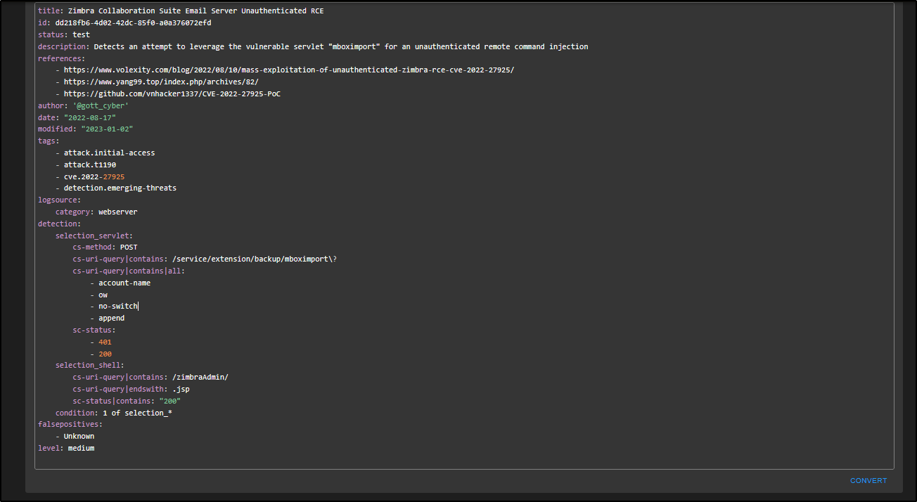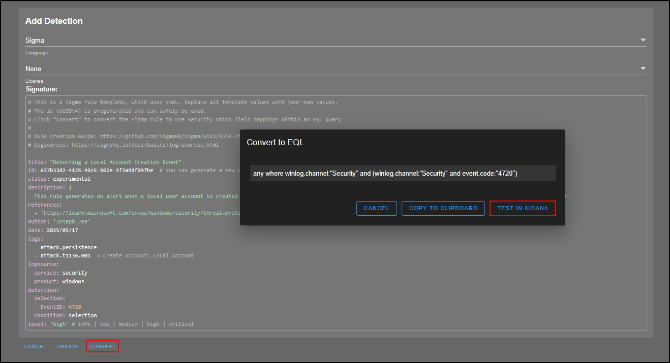 # Click "Convert" to convert the Sigma rule to use Security Onion field mappings within an EQL query