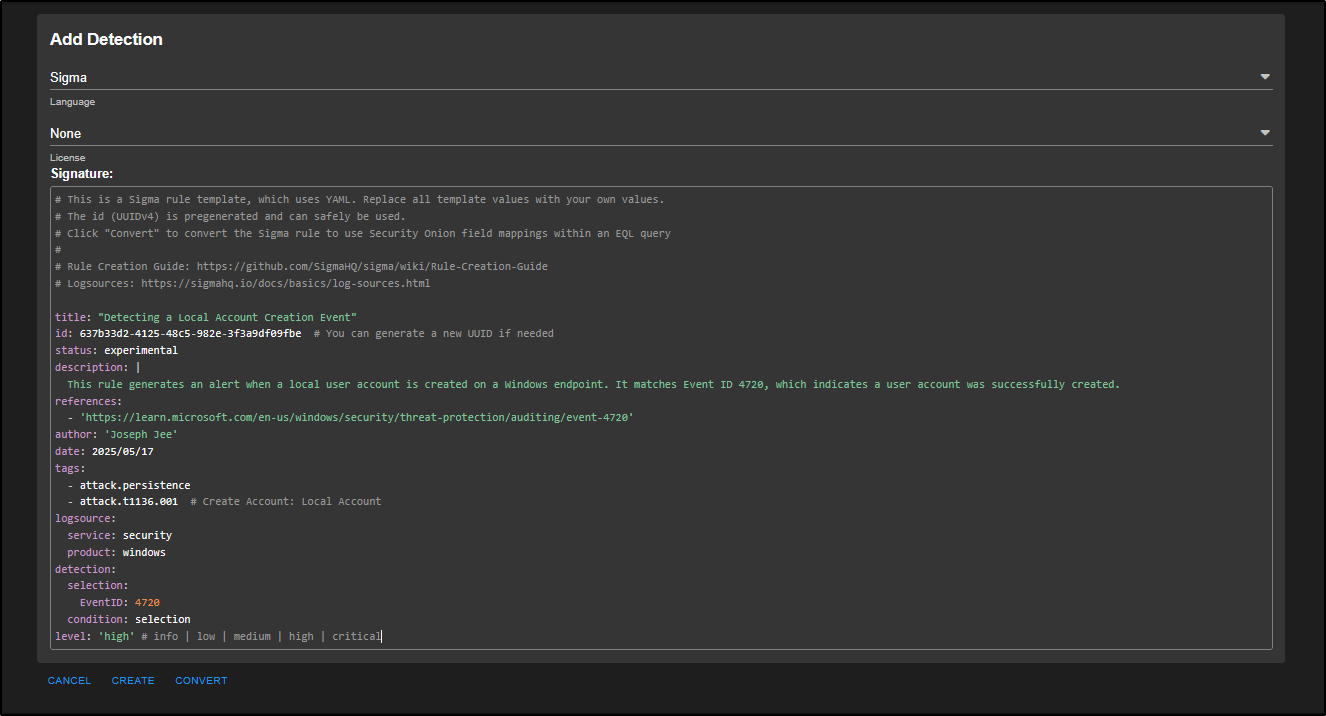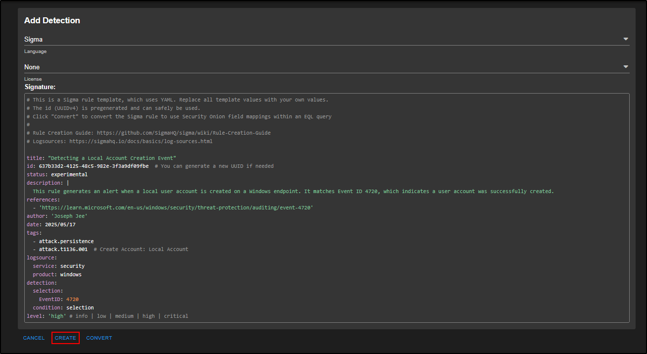 You will see a pre-filled Sigma template which outlines all the key fields like title, ID, log source, detection condition, etc. The URLs at the top link to guides that help you write proper Sigma rules: Sigma Rule Creation Guide and Logsources Reference.
