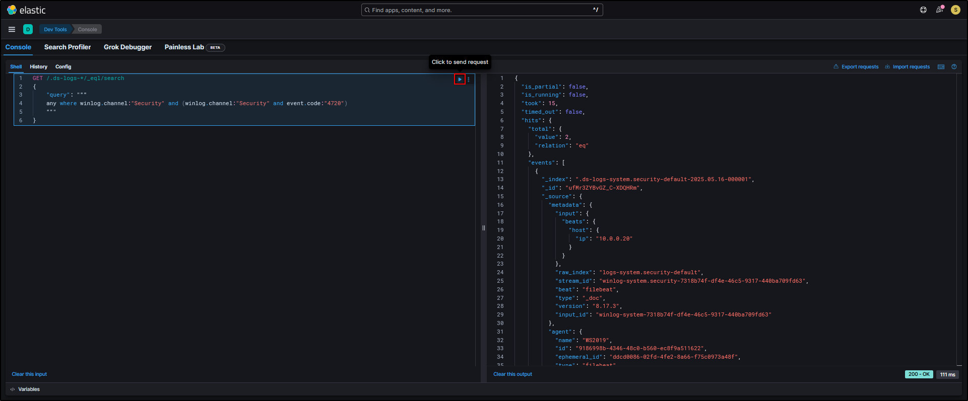- To test it live, click Test in Kibana. This will open the query in Kibana Dev Tools and return any matching results.