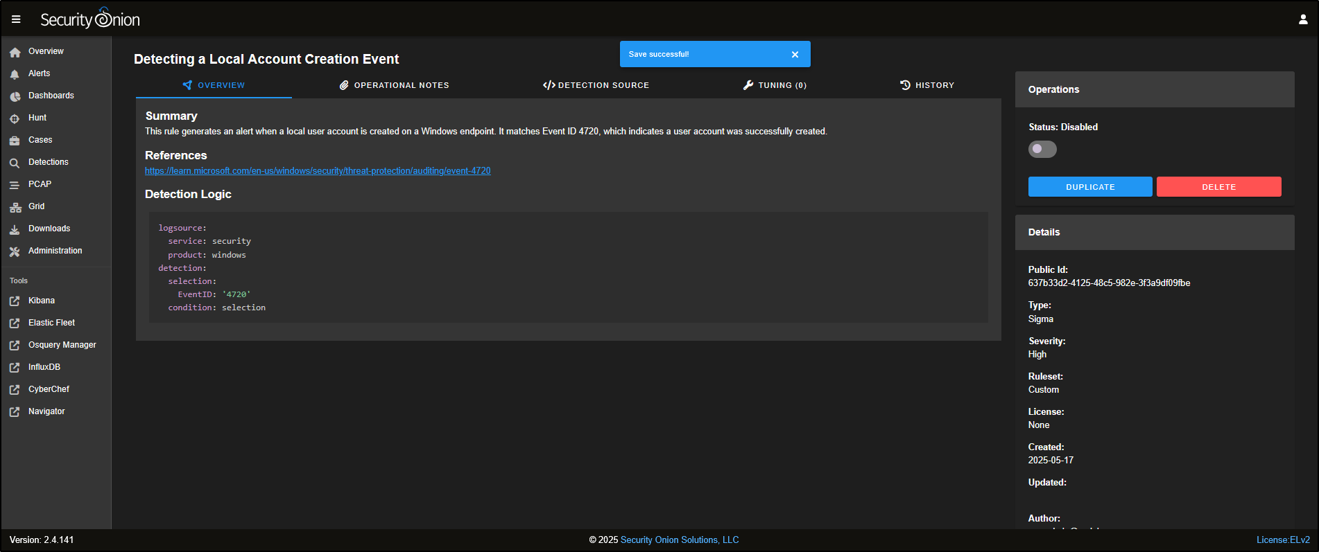 Now that the rule is active, any time a Windows Event ID 4720 is logged, which indicates a new local user account was created, we will receive an alert.