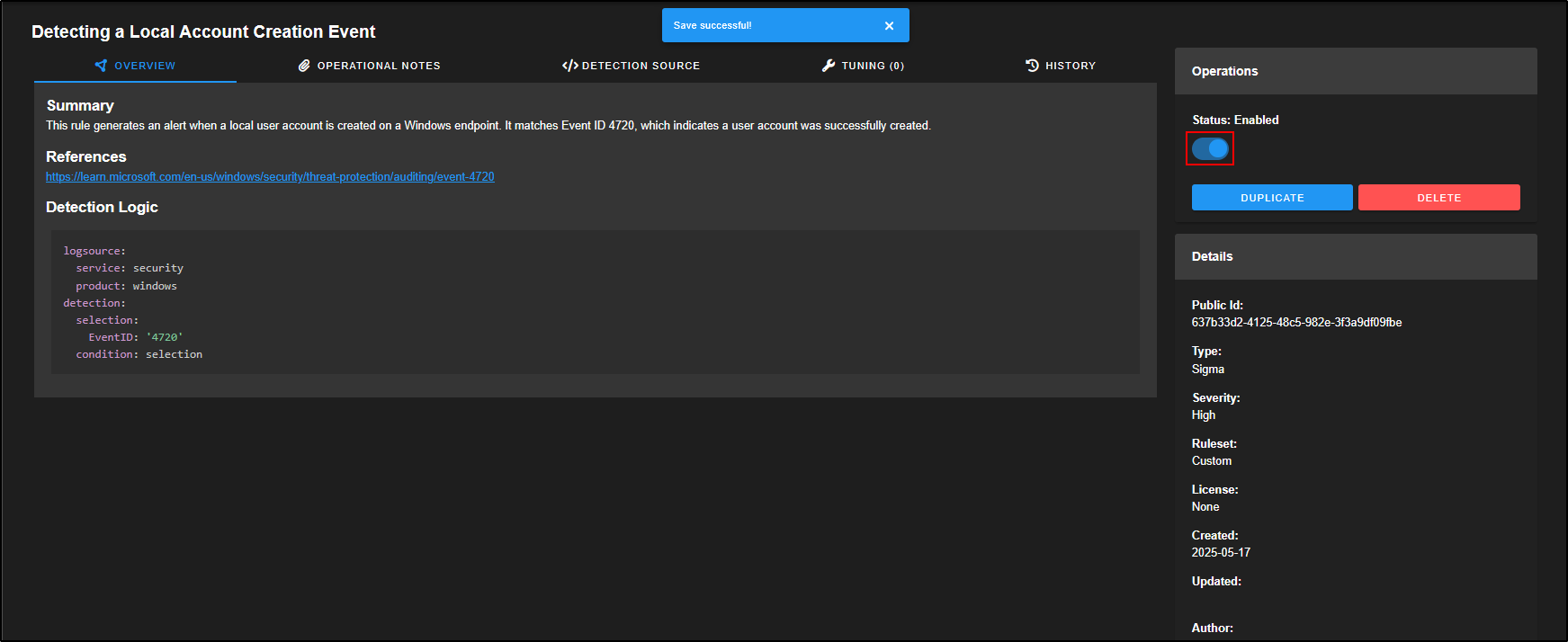 Everything looks fine here, so go ahead and click Create to add the Sigma rule to our list of detections.
