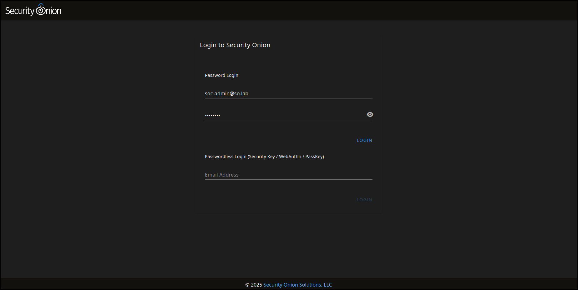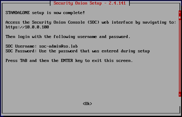 After installation is complete, you can access the SOC web interface by navigating to https://10.0.0.100