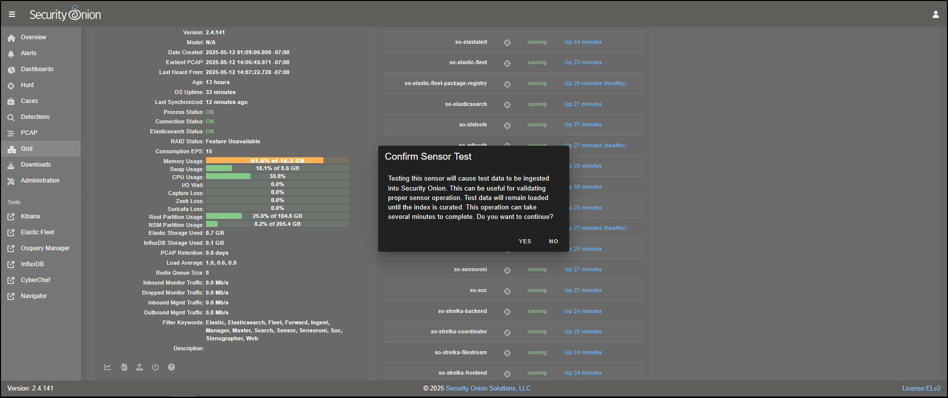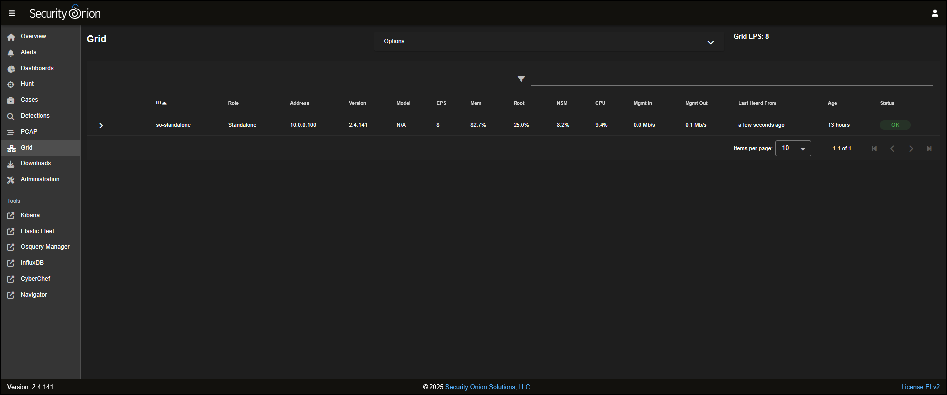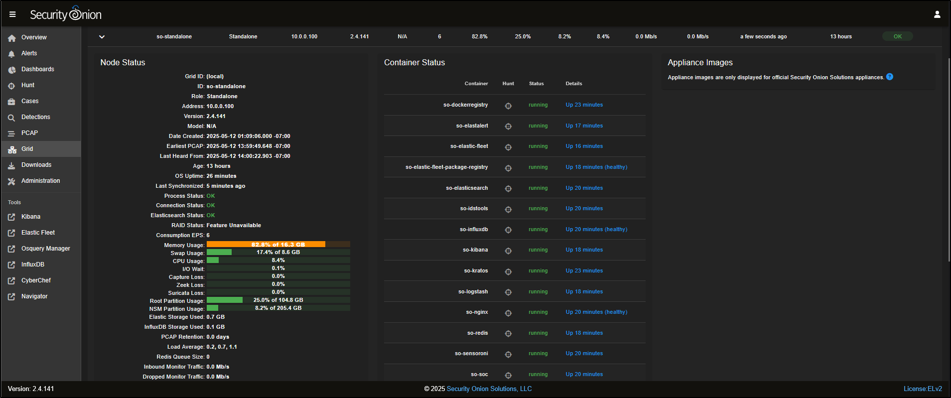 Navigate to Grid page and verify that all containers are running on the Security Onion Manager.