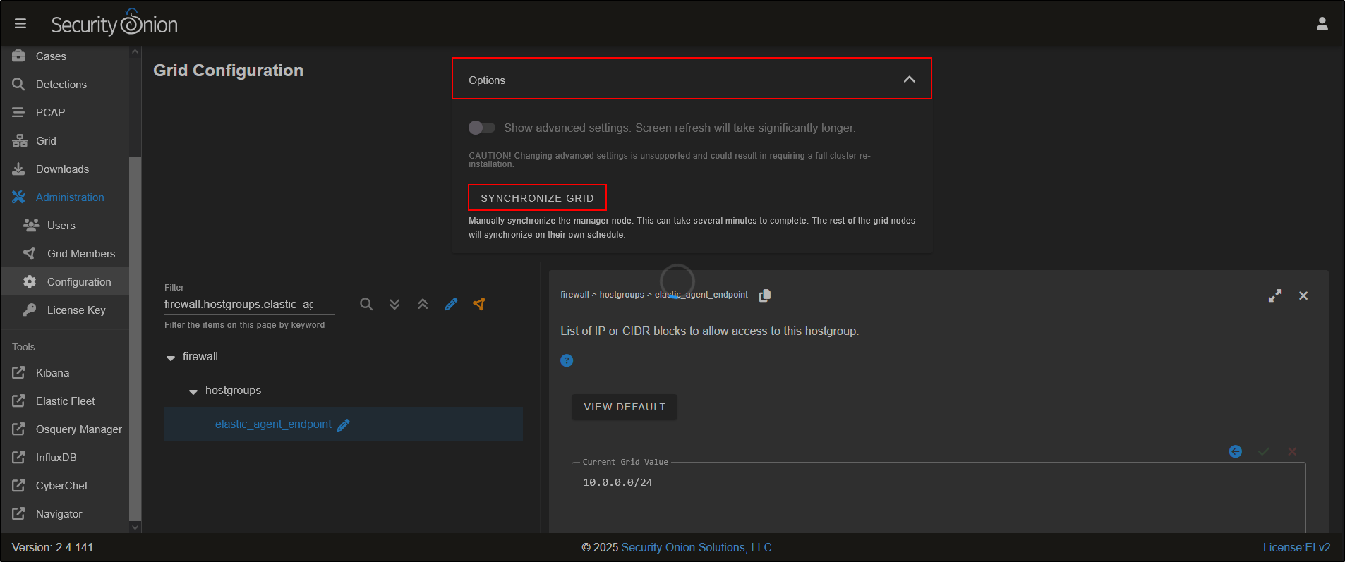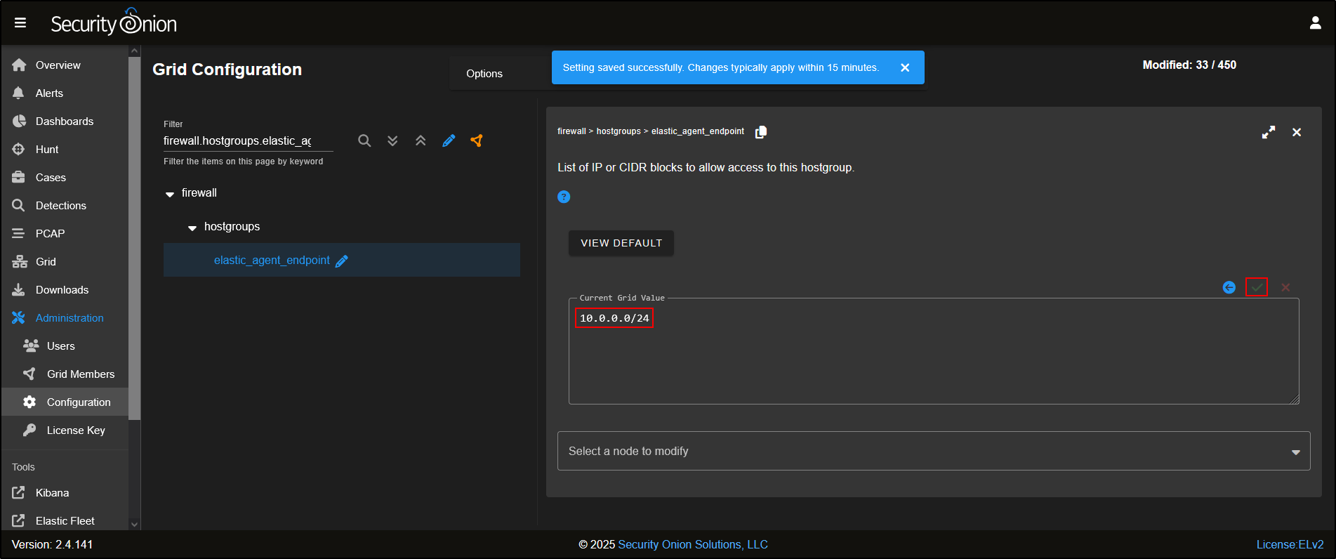 Select the quick link Allow Elastic Agent endpoints to send logs. This will automatically select firewall → hostgroups → elastic_agent_endpoint. Add *the agent’s subnet. Click the *green checkmark to apply changes. Note that the changes typically apply within 15 minutes.