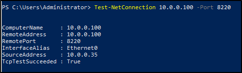 After waiting for several minutes, verify connection to 10.0.0.100 on port 8220 by running the following command in PowerShell from your Windows VM.