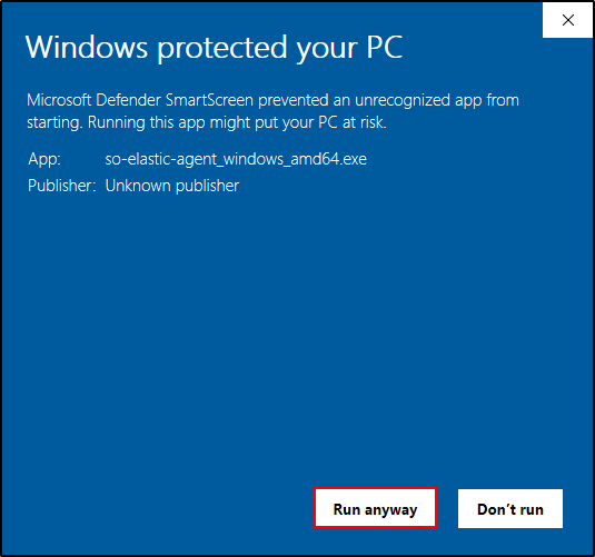 If Microsoft Defender SmartScreen prevents you from running the agent, click More info → Run anyway.