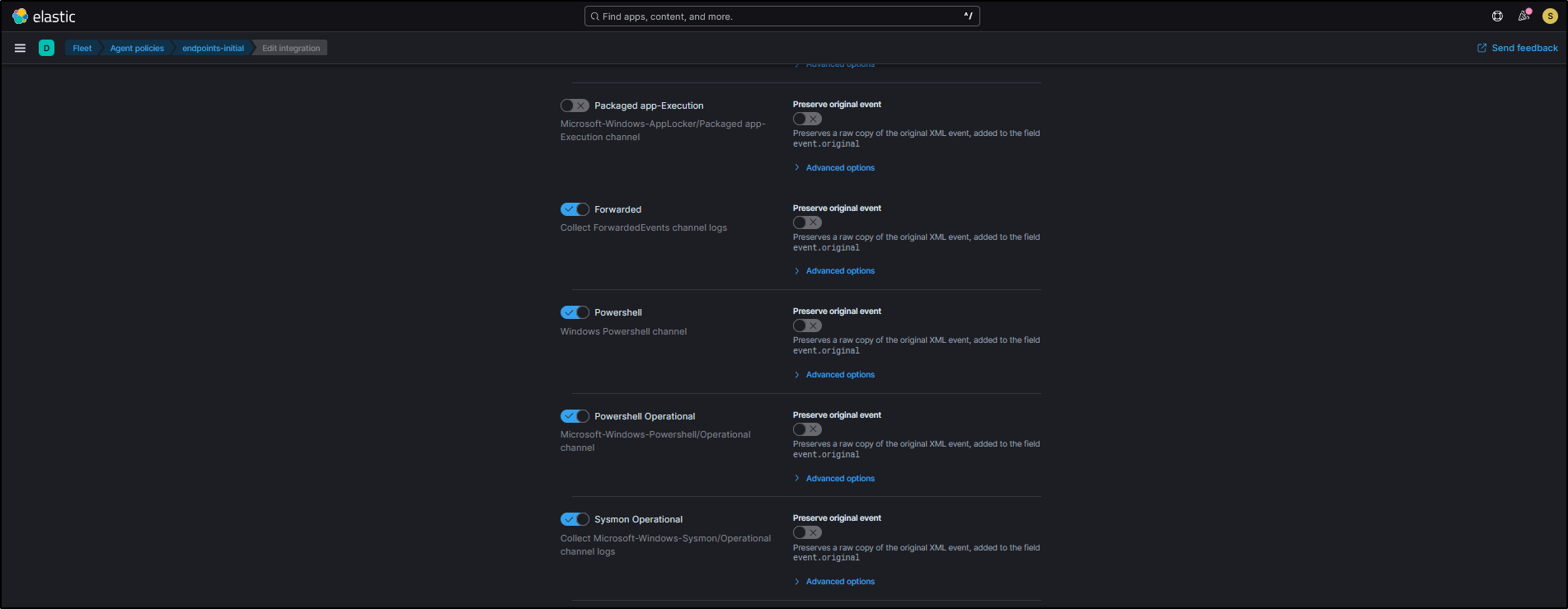 By default, Security Onion’s Fleet agent policies include integrations that collect Windows event logs from key channels such as PowerShell, ForwardedEvents, and Sysmon Operational.