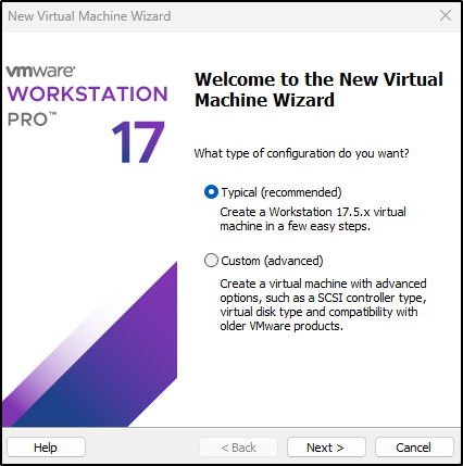 Open VMware Workstation and select Create New Virtual Machine. Choose Typical and click Next.